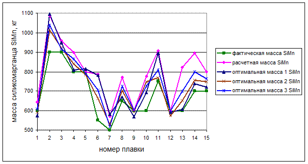 Рисунок 4 - Расчетные массы ферросплава, кг Исследуя результаты расчетов, представленных в табл.3 и рис.4, можно сделать предположение о том, что недостающий марганец система пыталась взять за счет увеличения массы силикомарганца SiMn, что вполне соответствует логике. Полученные расчетные массы ферросплавов показывают, что силикомарганца вполне достаточно для достижения в стали заданного содержания Mn и Si. Изменение рекомендуемых масс ферросплавов от одного просчета к другому связано с тем, что в процессе многочисленных просчетов одной и той же плавки произошла корректировка предыстории, и коэффициенты пересчета в результате адаптации приняли значения, близкие к реальным. Таким образом, разработанная модель соответствует задачам и технологии процесса раскисления и легирования и самонастраивается в процессе работы, а результаты расчетов полностью достигли поставленной цели. 2.4 Исследование и оптимизация технологии на основе модели и экспериментальных данныхНе принимая во внимание высокие цены на ферросплавы, при подходе к определению их расхода можно получить более высокие денежные затраты на раскисление и легирование, нежели в результате оптимизации масс подаваемых ферросплавов с учетом их ценовой стоимости. Однако, учитывая только цены ферросплавов, с экономической точки зрения выгоднее будет не подавать их совсем, что недопустимо. Поэтому помимо ценовой стоимости ферросплавов необходимо учитывать и получение заданного состава готовой стали, причем получение состава готовой стали на нижнем пределе допустимого диапазона содержания элементов в стали. Учитывая выше написанное, оптимизацию процесса раскисления и легирования лучше всего представить введением в сталь необходимых масс элементов с учетом их угара, имея при этом минимальные экономические затраты, которые обеспечиваются путем использования более дешевых ферросплавов вместо дорогих, получая при этом тот же результат, то есть состав готовой стали. Для определения эффекта оптимизации предусмотрено разветвление алгоритма, представленного на рис. 3. Угоревшие массы элементов, определенные с помощью алгоритма, передаются в блок оптимизации, где происходит поиск минимума критерия, включающего в себя ценовую составляющую и составляющую, определяющую состав готового металла. Результатом оптимизации являются массы ферросплавов, которые подаются на предстоящую плавку. Итоговая формулировка критерия оптимизации представлена с помощью формулы: