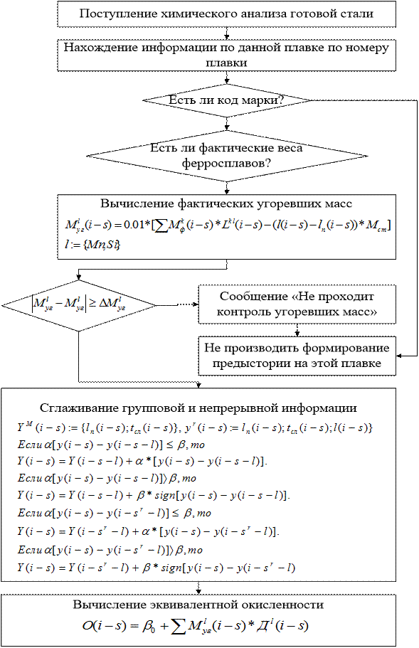 Рисунок 11 - Блок-схема алгоритма контроля входной информации В блоке 4 выбираются задания по углероду, марганцу и кремнию готовой стали для требуемой марки стали. Работа вычислительного алгоритма по расчету раскислителей и легирующих производится по 7 группам марок стали. Каждая группа марок стали характеризуется одинаковым угаром марганца и кремния и относительно одинаковым их содержанием в готовой стали разных марок. С вводом марки стали определяется принадлежность этой марки к той или иной группе, и формируется для расчета групповая и непрерывная предыстория. По коду марки определяется задание на содержание элемента в готовой стали, допустимые пределы на содержание этого элемента, а также вид раскислителей, применяемых на этой марке. В блоке 5 осуществляется расчет (восстановление) фактических угоревших масс элементов и эквивалентной окисленности. По номеру плавки находится в предыстории бланк на эту плавку, по которому определяется, вводил ли мастер по этой плавке код марки, то есть, производился ли расчет ферросплавов на данную марку. Проверяется также, ввел ли контролер отдела технического контроля фактические веса ферросплавов, по которым производится расчет фактических угоревших масс элемента, определяемый как разность между массой элемента в отданном ферросплаве и массе элемента, находящегося на плавку. Если код марки или фактические веса раскислителей не вводились или фактический угар не проходит контроль по ограничению, то расчет по этой плавке не производится. Если введены код марки и фактические веса ферросплавов, угар элемента прошел контроль, по данной плавке формируется предыстория. В непрерывной предыстории производится релейно-экспоненциальное сглаживание значений углерода и марганца, полученных на повалке, и времени слива. В групповой предыстории производится релейно-экспоненциальное сглаживание значений углерода и марганца на повалке, времени слива, значений углерода, марганца и кремния готовой стали. Эквивалентная окисленность определяется как остаточная окисленность после отдачи раскислителей по каждой группе марок отдельно плюс пересчитанные в окисленность через коэффициент перевода Д угара марганца и кремния угоревшей массы. Блок-схема расчета фактических угоревших масс и эквивалентной окисленности представлена на рис.12. В блоке 6 происходит адаптация коэффициентов пересчета. Алгоритм адаптации начинает свою работу с приходом химического анализа готовой стали. Ошибки прогноза угара элементов и эквивалентной окисленности на плавку определяются как разность между фактическим угаром элемента и расчетной по угару эквивалентной окисленностью и их прогнозируемыми значениями на данную (i-s)-тую плавку. Вычисление приращений времени слива и времени додувки для непрерывной предыстории производится как разность значений между временем слива и додувки на (i-s)-той плавки и