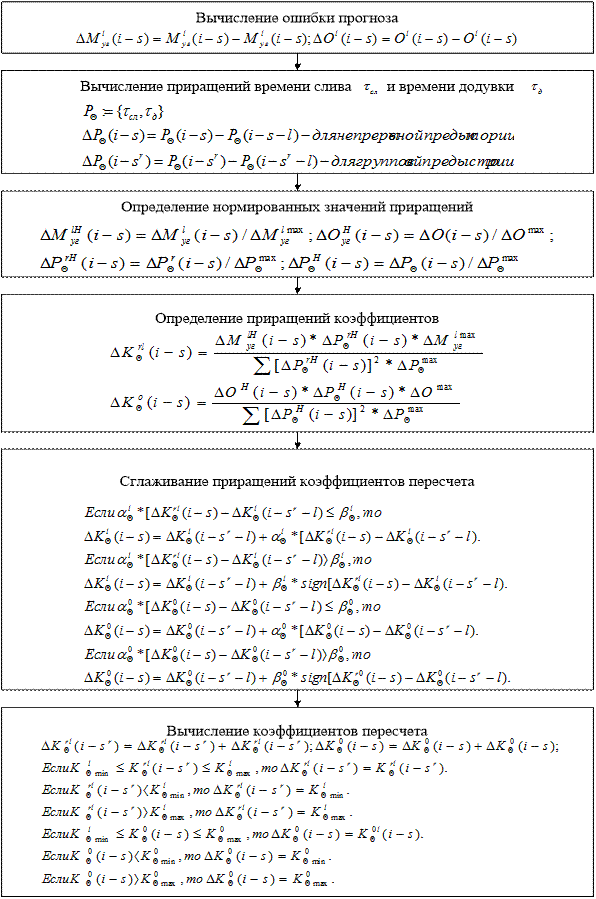 Рисунок 12 - Блок-схема расчета фактических угоревших масс и эквивалентной окисленности предыдущей ближайшей плавкой, для групповой предыстории – как разность между (i-s)-той плавкой и ближайшей предыдущей плавкой по группе. Ошибки прогноза угоревших масс и эквивалентной окисленности и приращения времени слива и додувки нормируются и по ним рассчитываются приращения коэффициентов. Затем эти приращения сглаиваются релейно-экспоненциальным фильтром, и по сглаженным значениям приращений корректируются спрогнозированные коэффициенты пересчета на (i-s)-той плавке. Эти же коэффициенты заносятся во все последующие бланки по плавкам. Алгоритм адаптации коэффициентов пересчета представлен на рис.13. Обозначения всех элементов данного алгоритма и всех последующих алгоритмов даны в приложении 6 данного дипломного проекта. В блоке 7 осуществляются расчетные приведения угоревшей массы элемента и эквивалентной окисленности к базовым условиям по контролируемым факторам. По приходу химического анализа готовой стали эквивалентная окисленность приводится к базовым условиям по углероду и марганцу на повалке и их взаимовлиянию на окисленность, времени слива и времени додувки, углероду, марганцу и кремнию в готовой стали и их взаимовлиянию на процесс раскисления. Приведение к базе угоревших масс элементов производится по тем же параметрам, что и эквивалентная окисленность, но значения коэффициентов пересчета берутся различные для каждой группы марок стали. Блок-схема алгоритма приведения представлена на рис.14. В блоке 8 происходит экстраполяция приведенных угоревших масс элементов и эквивалентной окисленности. Сглаженные релейно-экспоненциальным фильтром значения базовой окисленности прогнозируются на последующие по номерам плавки. Для угоревших масс элементов в зависимости от того, как давно плавилась данная марка стали, выбирается настройка сглаживателя a1 1 или a1 2 для каждого элемента. При этом если марка стали через DN плавок, то настройка сглаживателя берется равной a1 2 .