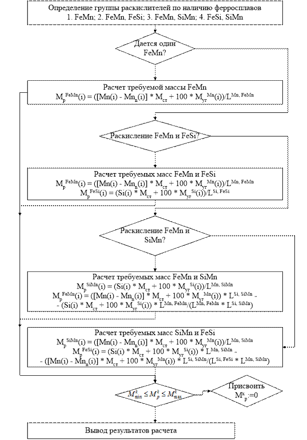 Рисунок 17 - Блок-схема алгоритма пересчета эквивалентной окисленности и угоревших масс на условия текущей плавки том прогнозируемого угара и процентного содержания элемента в ферросплаве. На тех марках, которые не раскисляются двумя ферросплавами, содержащими один и тот же элемент (FeMn, SiMn; FeSi, SiMn), расчетная масса находится решением системы двух уравнений. Если производится расчет FeMn и SiMn, то сначала рассчитывается SiMn на необходимое количество кремния в готовой стали, а затем – FeMn с учетом марганца в SiMn. Если производится расчет FeSi и SiMn, то сначала рассчитывается SiMn на необходимое количество марганца в готовой стали, а затем рассчитывается FeSi с учетом кремния в SiMn. Рассчитанные массы раскислителей проходят контроль на минимальный диапазон. Блок-схема алгоритма расчета масс ферросплавов представлена на рис.18.