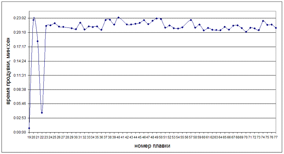 Рисунок 5.6 - Последовательность изменения времени продувки, мин:сек, в зависимости от номера плавки