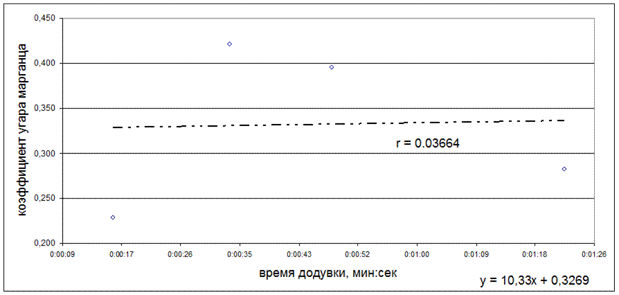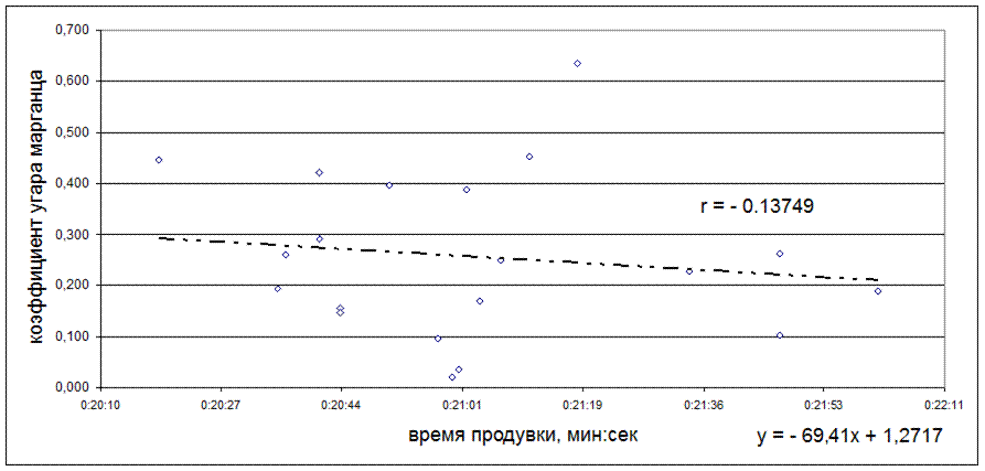 Рисунок 5.19 - Зависимость коэффициента угара марганца от времени слива, мин:сек