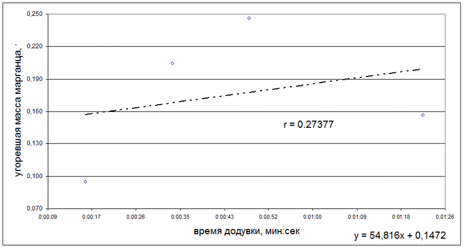 Рисунок 5.17 - Зависимость угоревшей массы марганца, т, от времени додувки, мин:сек
