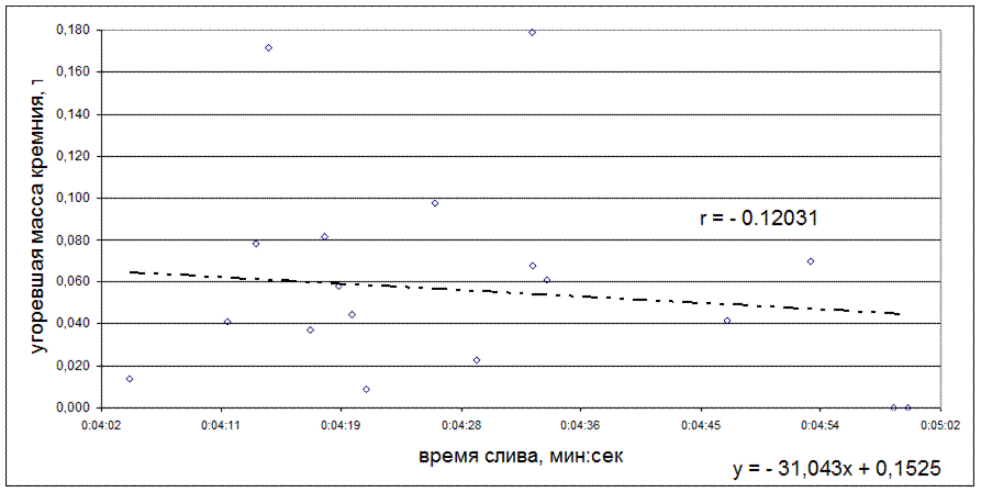 Рисунок 5.20 - Зависимость коэффициента угара кремния от времени слива, мин:сек