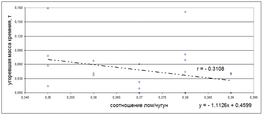 Рисунок 5.26 - Зависимость угоревшей массы кремния, т, от соотношения лом/чугун