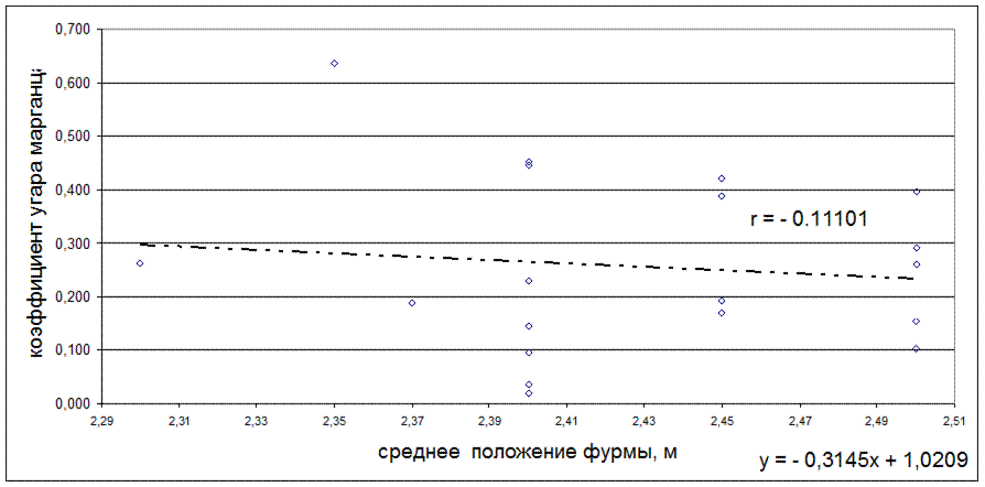 Рисунок 5.27 - Зависимость коэффициента угара марганца от среднего положения фурмы, м
