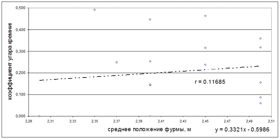 Рисунок 5.28 - Зависимость коэффициента угара кремния от среднего положения фурмы, м