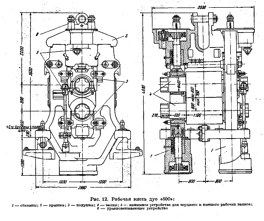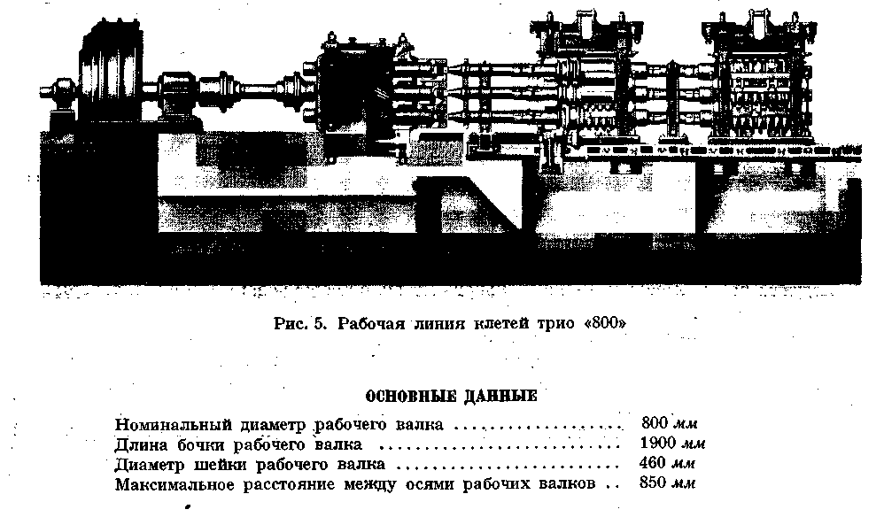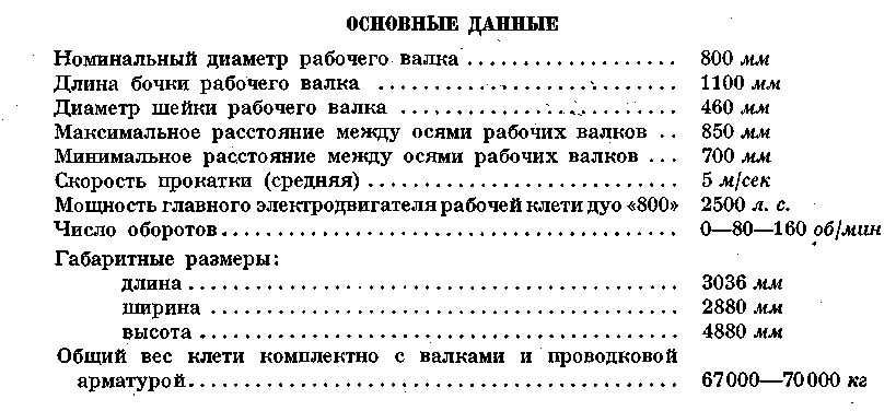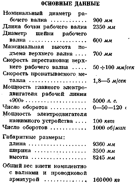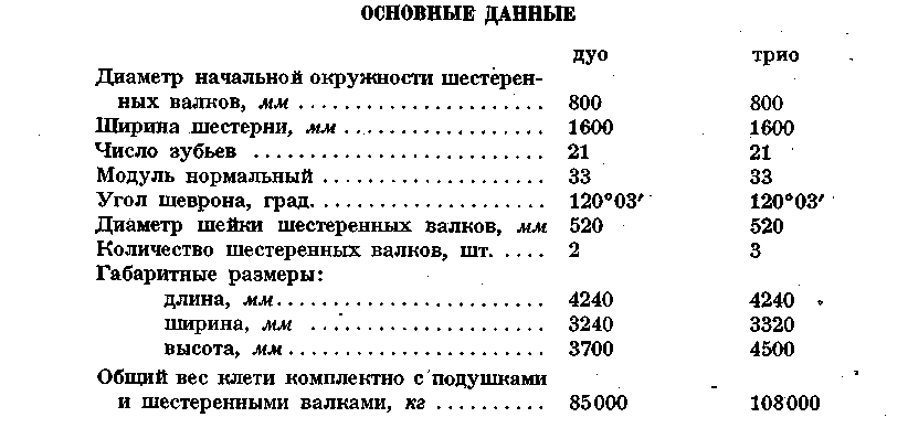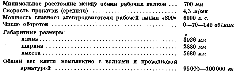 Рабочая клеть дуо «800» состоит из двух станин, крышки, комплекта подушек и валков, нажимных устройств для верхнего и нижнего рабочих валков и уравновешивающего устройства. Станины клети - открытой конструкции из стального литья, Крышка клети, из стального литья, крепится к станинам при помощи специального клинового соединения. Подушки рабочих валков изготовляются из стального литья, с текстолитовыми вкладышами подшипников. Рабочие валки — литые, чугунные. Нажимные устройства Для верхнего и нижнего рабочих валков, состоящие каждый из двух винтов с цилиндрической зубчатой передачей, обеспечивают вертикальную установку валка от ручного привода. Винт вращается в бронзовой гайке, установленной в станине и крышке клети. Валки в осевом Направлении устанавливаются при помощи прижима, закрепленного на станине болтами. Прижимы упираются в подушки, а в хвостовой своей части имеют регулировочный винт, который, в свою очередь, упирается через вставку в тело станины. Уравновешивающее устройство верхнего валка — пружинное, через тяги, проходящие через крышку клети и закрепляемые с помощью клиньев в бугелях. Перевалка валков производится комплектно клетью, которая снимается краном за проушины крышки клети с рабочей линии стана на стенд, откуда подготовленная клеть с валками, подушками и проводковой арматурой устанавливается на рабочую линию стана тем же мостовым краном. Рабочая клеть дуо «800» установлена в отделочной линии стана в количестве одного комплекта и по расположению входит в состав чистовой линии стана. Привод клети осуществлен через шестеренную клеть дуо «800», промежуточные шпиндели и главную муфту от электродвигателя постоянного тока мощностью 2500 л. с. с регулируемым числом оборотов 0—80—160 об/мин. В случае аварии привода рабочая клеть дуо «800» может иметь привод от электродвигателя рабочих клетей трио «800», так как между смежными клетями дуо и трио предусмотрена установка шпиндельного соединения. Шестеренная клеть, промежуточные шпиндели и главная муфта предназначены для передачи вращения от электродвигателя к рабочим валкам клети. Отделочная рабочая клеть дуо «800» оборудована с передней стороны рабочим рольгангом с исчезающими манипулятором и кантователем и с задней — отводящим рольгангом. Кроме того, клеть оборудована с обеих сторон раскатными рольгангами и цепными шлепперами, обеспечивающими перемещение полосы От одной рабочей клети к другой. Смазка зубчатого зацепления нажимных устройств — густая, закладная, а других трущихся соединений — ручная через пружинные масленки. Смазка шеек валков и их охлаждение производится технической водой от водопроводной магистрали цеха.