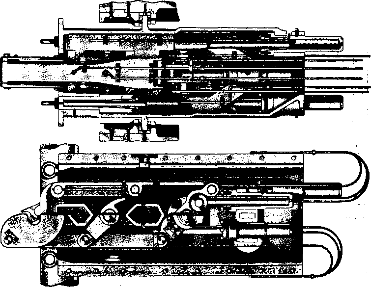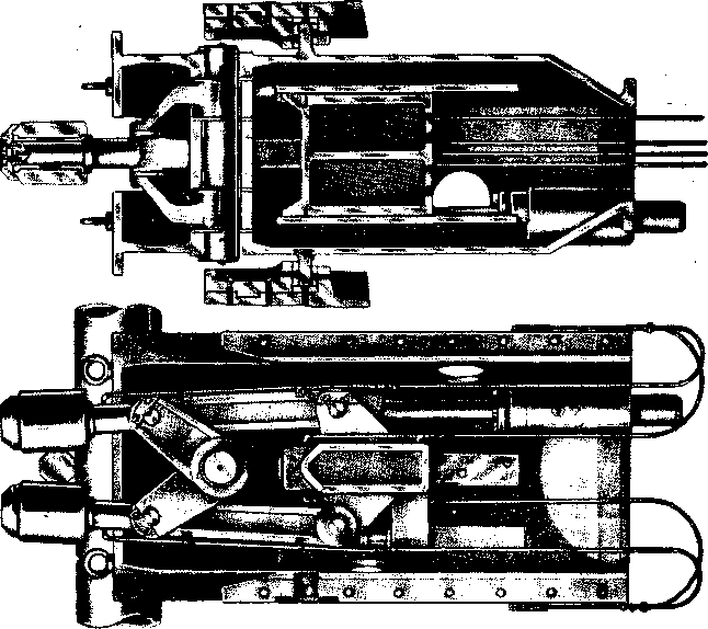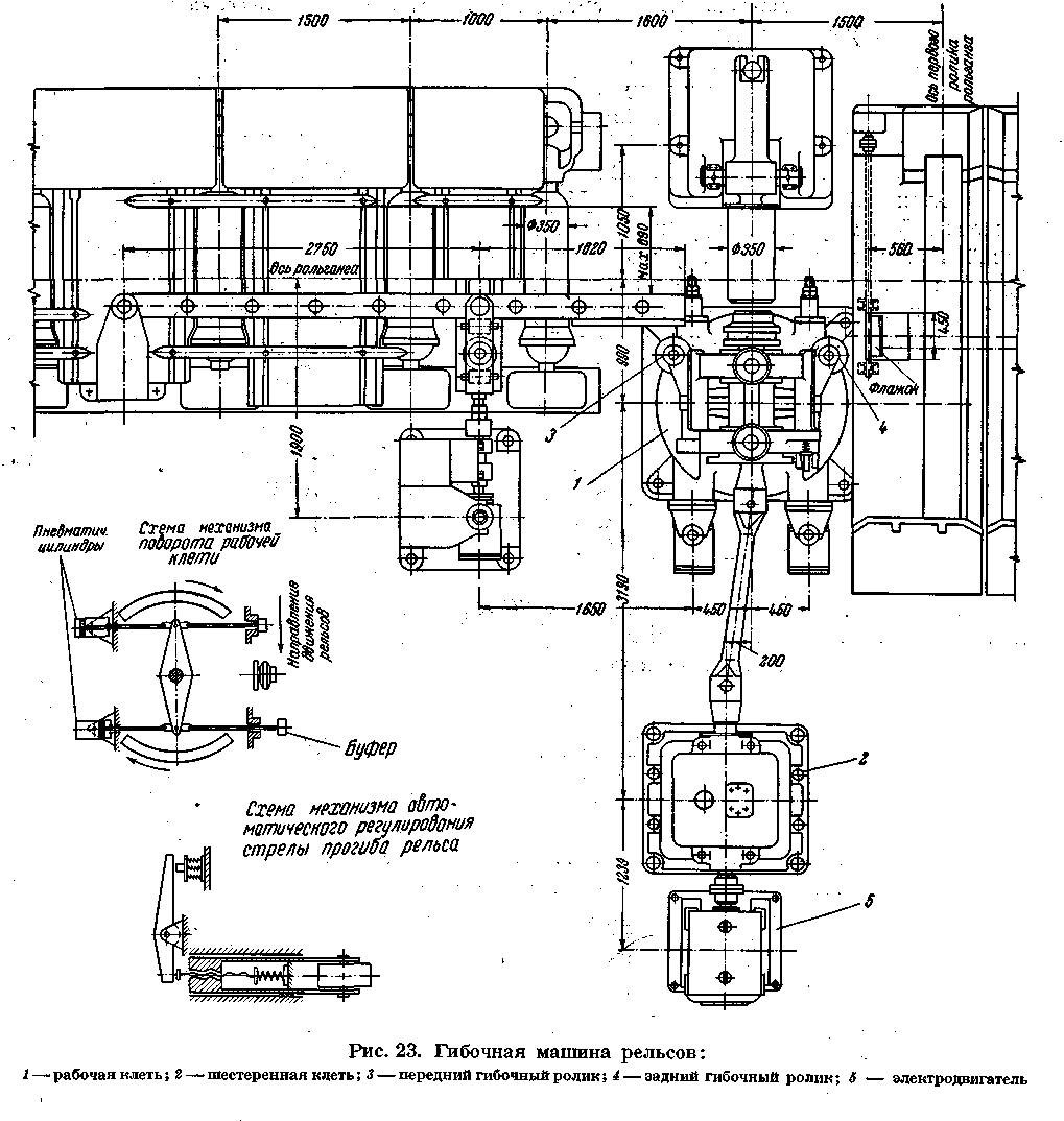 ОБЪЕМ ПОСТАВКИ Механическое оборудование штемпельной машины поставляется комплектно с трубопроводами, шлангами, крепежными болтами и другими материалами, согласно описанию и спецификации. 114108. ГИБОЧНАЯ МАШИНА РЕЛЬСОВ Гибочная машина предназначена для гибки рельсов в горячем состоянии в сторону, обратную изгибу его при остывании на подошву. Гибочная машина состоит из рабочей и шестеренной клетей, переднего и заднего гибочных роликов и электродвигателя. Рабочая клеть машины состоит из одной станины с крышкой, двух горизонтальных консольных валков и двух вертикальных неприводных роликов, установленных по обеим сторонам станины. Привод консольных валков осуществлен от электродвигателя через шестеренную клеть и шпиндельное соединение. Передний ролик установлен неподвижно относительно станины. Задний гибочный ролик имеет возможность скользить в пазах станины, упираясь концом своего установочного винта в рычаг буфера заднего ролика. Задача рельса в гибочную машину производится передвижной проводкой, устанавливаемой на рольганге перед машиной. Выдача рельса симметрично оси рольганга осуществляется поворотом рабочей клети относительно опорной рамы на угол, заранее установленный при помощи буферов. Поворот рабочей клети производится пневматическими цилиндрами, воздух к которым подается автоматически путевым выключателем с противовесом, устанавливаемым на рольганге, по пути следования рельса. Автоматическое регулирование стрелы прогиба, в зависимости от температуры изгибаемого рельса, основано на изменении сопротивляемости рельса изгибу и осуществляется буфером заднего ролика. При переходе в процессе изгиба с одного профиля на другой меняется только плечо рычага буферного устройства передвижением пружинного стакана в пазах станины. Смазка трущихся поверхностей машины —густая, автоматическая, от центральной станции; смазка шестеренной клети—жидкая, также от центральной станции жидкой смазки.