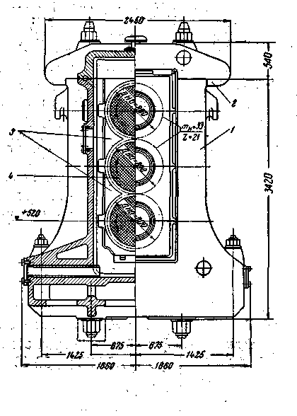 ОБЪЕМ ПОСТАВКИ Механическое оборудование рабочей клети дуо «800» поставляется комплектно с электрооборудованием, трубопроводами, проводковой арматурой, анкерными болтами, плитовинами, смазочной системой в пределах клети и другими материалами, согласно описанию и спецификации. 114105, ШЕСТЕРЕННЫЕ КЛЕТИ ДУО И ТРИО «800» Шестеренные клети дуб и трио «800»' предназначены для передачи вращения от приводных электродвигателей к валкам рабочих клетей соответственно дуо или трио. Обе клети являются одинаковыми и отличаются только числом шестеренных валков, подушек и размерами по. высоте. Шестеренная клеть дуо состоит из станины, крышки, комплекта подушек и шестеренных валков. Станина и крышка клети -— литые, чугунные. Крышка клети крепится со станиной при помощи мощных четырех стяжных болтов, проходящих через весь корпус станины. Подушки клети — из чугуна, а подшипники шестеренных валков имеют баббитовую заливку. Подушки клети монтируются в окна станины . сверху. Шестеренные валки изготовляются стальными, коваными, с шевронными фрезерованными зубьями и термически обработаны. Шестеренная клеть устанавливается , непосредственно на фундамент на анкерных , болтах. Смазка подшипников и зацепления шестеренных валков — жидкая, циркуляционная, от центральной смазочной станции. Уплотнение от утечки масла достигается при помощи торцевых кожухов и колец, сбрасывающих масло, устанавливаемых на шейках шестеренных валков.