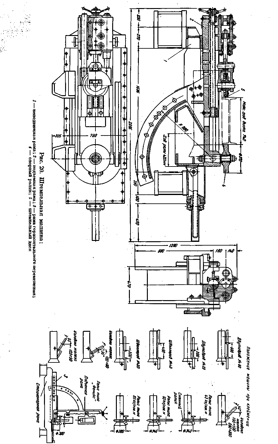 На неподвижной раме монтируются-рама горизонтального перемещения и подъемная рама машины. Рама горизонтального перемещения с ходовым винтом — сварная, на которой установлена станина подъемной рамы с опорным роликом и штемпельным диском. Перемещение подвижной рамы осуществляется при помощи винта и гайки вручную. Подъемная рама с профилированным сектором, пневматическим цилиндром и штемпельным диском, представляет собой станину прямоугольной формы, которая, находясь в разных положениях по. отношению к движущемуся профилю, производит клеймение полосы. При клеймении швеллеров и двутавров станина поворачивается в подвижной раме и устанавливается горизонтально, а при клеймении уголков и рельсов — в наклонном или вертикаль- ном положении и укрепляется болтами. Поворот, станины производится с помощью крана. Штемпельный диск снабжен набором знаков для шести номеров плавок, пять из которых закрыты кожухом. Прижим штемпельного диска к полосе осуществляется пневматическим цилиндром, с рабочим ходом поршня 100 мм. При клеймении полоса, проходя штемпельную машину, воздействует на флажковый выключатель, установленный за машиной, которым включается подача воздуха в цилиндр прижима диска, и диск, прижимаясь к движущейся по рольгангу полосе, наносит на нее номер плавки. При дальнейшем движении полосы она воздействует на второй флажкового типа выключатель, которым включается подача воздуха в цилиндр в обратном направлении, и диск поднимается над полосой в исходное положение. Смазка трущихся поверхностей — густая, закладная, от шприца. Штемпельная машина устанавливается на подводящем рольганге к холодильнику перед гибочной машиной.