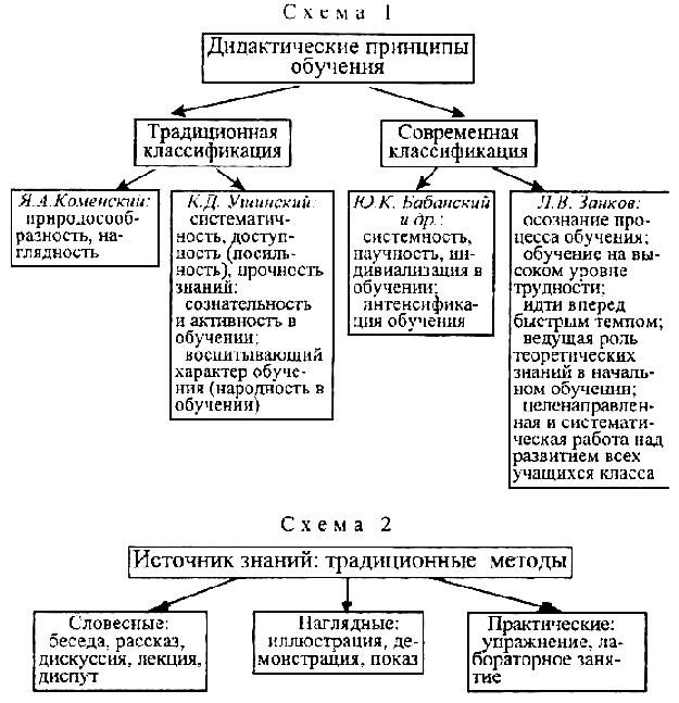Инновационные методы. В современном образовании используется ряд активных методов обучения, способствующих формированию интеллектуальных умений студентов. Среди них часто используются такие, как: метод мозгового штурма, временных ограничений, манипулятивный метод, метод абсурда; обучение по алгоритму и др. Классификация методов достаточно условна. Выбор методов зависит от цели и задач обучения, от содержания учебного материала, специфики обучаемости учащихся. Природа педагогических явлений требует прежде всего систематических наблюдений за учащимися, постановки новых задач и решения проблемных ситуаций, т.е. методов, ведущих к цели, входящих в систему данных действий преподавателя и студента. Работа с опорными схемамиУчебные установки. Понимание схемы как внутренней интеллектуальной психологической структуры, управляющей организацией мышления и поведения человека, позволяет увидеть изложение темы логико-графическим языком с помощью значимых опор. Опорная схема подкрепляет словесную форму изложения материала наглядно-образным его видением. Опорные схемы помогают студенту подготовиться к зачету (часто являются третьим вопросом на экзамене по педагогике). Зачетная письменная работа студента выглядит более выигрышно, если часть материала систематизирована в ней с помощью опорных схем. По классификации опорные схемы могут быть обобщающими, конкретизирующими, разъясняющими проблему или тему. В пособии представлены группы схем к обобщающим лекциям, к раскрытию теории и практики проблем дидактики, разъясняющие современный урок и педагогические технологии. Их представление единым блоком свидетельствует о их взаимосвязи, которую мы рассматриваем как взаимодействие, взаимопроникновение, взаимообогащение. Студент, изучив обобщающую схему, не только выбирает наиболее приемлемую, но и учится обосновывать свой выбор с помощью определенных смысловых опор. Для обобщающих опорных схем, вбирающих в себя обширный материал, сразу же после схем дается ряд заданий для лабораторно-практической работы (см. схемы к обобщающей лекции "Социализация личности"). Среди обобщающих групп схем много внимания уделяется схемам по теории и практике дидактики, которые особенно необходимы студенту-заочнику, не работающему в школе (см. схемы по дидактике). Среди конкретизирующих выделяются схемы, построенные на сравнении, сопоставлении дидактических и воспитательных систем, систем клубной работы и др. В таких схемах чаще всего даются параметры, по которым происходит сравнение. Так, например, дидактические системы (традиционные и инновационные) сравниваются По целям, признакам и возможностям данной системы для развития личности. Разъясняющие опорные схемы несут иную смысловую нагрузку. Их используют при объяснении нового, закреплении или для систематизации конкретного материала по теме. Так, например, среди этих схем могут быть такие: "Современный урок и его дидактические особенности"; "Оценка - отметка. Их роль в педагогическом процессе"; "Логика непосредственной подготовки учителя к уроку". Блок разъясняющих схем часто сопровождают педагогические технологии. Алгоритм самостоятельной работы с опорными схемами может быть следующим: обратить внимание на название схемы; выявить ключевые понятия; выявить по схеме критерии и показа