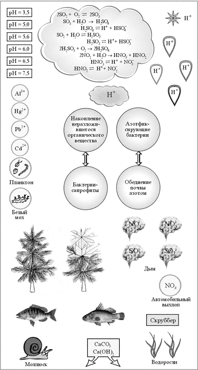 Написанное на схеме 3 уравнение предварительно можно закрыть плотным листом бумаги и попросить ребят самостоятельно его составить. При проверке лист бумаги снимается. Необходимо сказать и об опосредованном влиянии кислотных осадков на жизнедеятельность птиц. Оно происходит через цепи питания птиц с узкой пищевой специализацией, например питающихся свежей рыбой. Типичными представителями этих видов являются птицы, занесенные в Красную книгу РСФСР: белоклювая гагара, розовый пеликан, кудрявый пеликан, хохлатый баклан, малый баклан, колпица, каравайка, скопа, орлан-белохвост, стерх, черноголовый хохотун, рыбный филин [см. 6]. На схеме 3 изображена птица скопа, рядом с которой – рыба, перевернутая брюхом вверх, что обозначает уменьшение пищевых ресурсов; изображение другой рыбы с ионами тяжелых металлов (Нg2+ , Рb2+ , Сd2+ ) показывает отравление птицы через цепь питания. Большим преимуществом динамической схемы 1 является возможность действовать в обратном порядке. Разобрав на уроке способы предотвращения попадания кислотных выбросов в атмосферу и устранения последствий их воздействия на природу, можно с использованием динамической схемы 1 показать, как происходит улучшение экологической ситуации. Эта методика использования динамического средства наглядности совершенствует способность моделировать ситуации, развивает позитивное экологическое мышление. Основными способами предотвращения попадания кислотообразующих выбросов в атмосферу являются: а) очистка топлива перед сжиганием; б) использование газоочистителей (скрубберы) на заводах, теплоэлектростанциях; в) переход на другие экологически чистые виды топлива. Для демонстрации на трубы теплоэлектростанции и металлургического завода прикрепляют табличку «скруббер» (от англ. scrub – тереть щеткой, скрести). Действие различных по конструкции газоочистителей основывается на химических реакциях диоксида серы, содержащегося в дымовых газах электростанций, работающих на угле. Соединения, образующиеся в ходе этих реакций, можно либо сбрасывать в отходы, либо использовать как продукт, находящий сбыт [9]. После этого с динамической схемы 1 убирают изображения дыма и выхлопное облако автомобиля, часть облака с написанными уравнениями химических реакций образования кислот в атмосфере. Облако, на котором нарисован катион водорода, можно перевернуть обратной стороной или заменить на другое, без иона водорода; со схемы 1 снимают и осадки с ионами водорода. Один из способов ликвидации последствий закисления окружающей среды – внесение в почву и водные объекты гидроксида и карбоната кальция (известкование). На динамическую схему 1 можно прикрепить аппликацию с химическими формулами СаСО3 и Са(ОН)2 с указанием направлений внесения этих веществ в водный объект и почву. Принятие вышеописанных мер приводит к увеличению рН водной и почвенной сред до нормы и, как следствие этого, к восстановлению первоначального равновесия в биосфере. Эти процессы можно отразить, постепенно нанося на динамическую схему 1 исходные изображения. Таким образом, использование динамической схемы 1 позволяет моделировать многие процессы, происходящие в природе под действием кислотных осадков. При рассмотрении вопроса, связанного со снижением закисления биосферы, эту динамическую схему можно использова