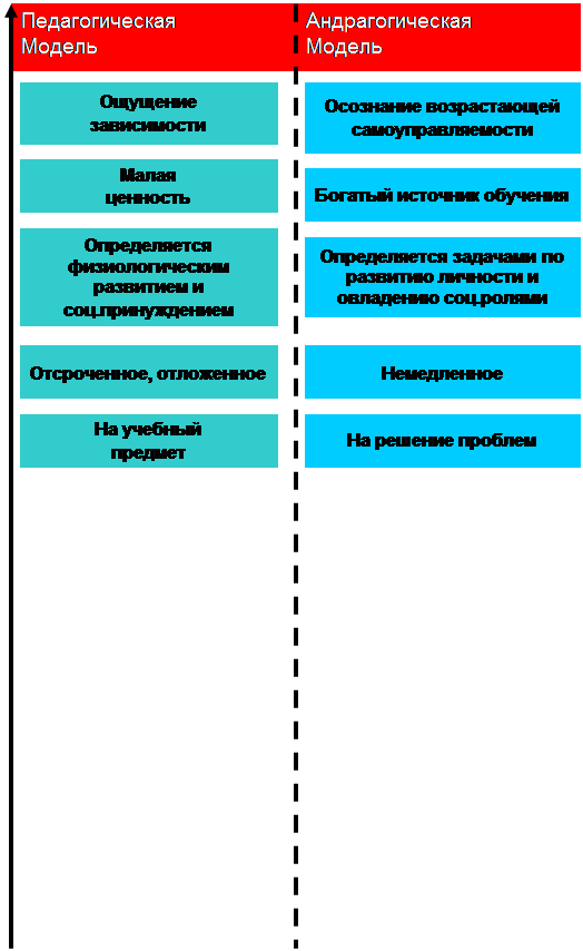 § 3. Андрагогическая модель обучения. Как любая наука андрагогика имеет свою структуру, понятийный и терминологический аппарат. Поскольку она выявляет общие закономерности обучения взрослых, то в ней выделяется теория обучения взрослых. Этот раздел исследует наиболее общие категории: особенности взрослого обучающегося, процесса обучения взрослых, взаимосвязи андрагогики с различными областями сферы образования, закономерности и тенденции развития образования и самой андрагогики. Андрагогика изучает и формулирует основные закономерности деятельности обучающихся в процессе обучения и потому ее составной частью является технология обучения взрослых . Каковы основные положения теории обучения взрослых? Их лучше рассмотреть, сопоставляя в общем педагогическую и андрагогическую модели обучения. Когда мы говорим о модели обучения , мы имеем в виду систематизированный комплекс основных закономерностей деятельностей обучающегося и обучающего при осуществлении обучения . При этом, конечно же необходимо учитывать и другие компоненты процесса — содержание, источники, средства, формы и методы обучения. Но основное в модели — это именно деятельность обучающегося и обучающего. Закономерности, определенные в модели обучения, характерны для того или иного подхода к организации процесса обучения, но они представлены именно в комплексе, в наиболее полном виде. В реальной практике они, естественно, реализуются в таком объеме далеко не всегда, а практически никогда. Это как бы идеальное представление о процессе обучения, которое формируется либо с точки зрения педагогики и обучения невзрослых, либо с точки зрения андрагогики и обучения взрослых. В самом общем виде можно сказать, что в педагогической модели обучения доминирующее положение занимает обучающий. Именно он определяет все параметры процесса: цели, содержание, формы и методы, средства и источники обучения. В силу объективных факторов (несформированности личности, зависимого экономического и социального положения, малого жизненного опыта, отсутствия серьезных проблем, для решения которых необходимо учиться) обучаемый в педагогической модели занимает подчиненное, зависимое положение и не имеет возможности серьезно влиять на планирование и оценивание процесса обучения. Его участие в реализации обучения в силу тех же причин также достаточно пассивно: ведь его основная роль — это восприятие социального опыта, передаваемого обучающим. В андрагогической модели ведущая роль принадлежит самому обучающемуся. Взрослый обучающийся — активный элемент, один из равноправных субъектов процесса обучения. Основоположник андрагогики М.Ш.Ноулз основные различия между андрагогической и педагогической моделями обучения видит в следующем: