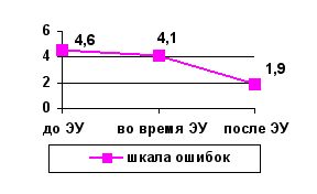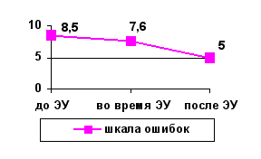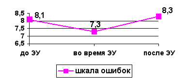 Изменения точности (фиксируется изменения скалы ошибок на 500 знаков до ЭУ, во время и после ЭУ) представлены на графике 2.