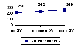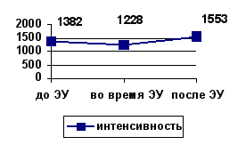 Изменения интенсивности (определяется по количеству всего просмотренных знаков всеми учениками, до ЭУ, во время и после ЭУ) представлены на графике 1.