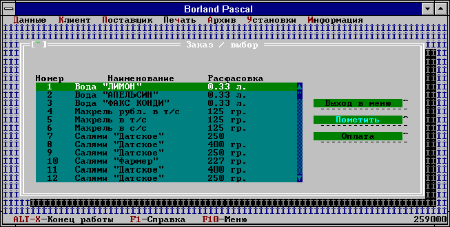 Введя данные, их надо сохранить. Чтобы это сделать надо сначала открыть файл, затем в его конец записать данные и в конце этот файл закрыть. Это делается приблизительно так ( подробно см. файл FIRMA.PAS) : OpenPrihodFile; { Процедура открытия файла см.модуль SklFiles.Pas} Seek(PrihodFile,FileSize(PrihodFile)-1); Write(PrihodFile,PrihodData); ClosePrihodFile; { см. модуль SklFiles.Pas} Если нажимается кнопка СБРОС, то вызывается процедура сброса прихода в которой все задействованные файлы данных усекаются до предыдущей длина (в начале процедуры PRIH запоминаются текущие длины файлов) при помощи стандартной процедуры TRUNCATE. После успешного ввода данных появляется запрос о печати приходной накладной. Печать осуществляется стандартными средствами (см. процедуры PrintPrihodNakl и PrintEndOfPrihodNakl в модуле SklUnit). С помощью константы LST, компьютер связывается с печатающим устройством на LPT1, затем процедурами Writeln(LST,‘строка для печати’) данные выводятся на принтер. Все введенные данные помещаются в файлы данных : SKLAD.001 (Товар на складе) , PRIHOD.001 (Заголовки приходов), PRIHOD.002 (Пришедшие наименования). Затем пользователь получает доступ к следующим командам меню : Данные-Склад, Данные-Приходы, Печать-Прайс-Лист, Печать-Отчет о наличии товара на складе, Клиент-Продажа. Основной из вышеперечисленных команд является Клиент-Продажа. При помощи этой команды пользователь должен выписать накладную по заказу клиента. Реализовал эту команду так : Появляется диалоговое окно со списком наименований, имеющихся на складе (В нем пользователь выбирает продаваемые наименования и их количества). Затем при нажатии на кнопку ОПЛАТА появляется окно со списком всех выбранных наименований (накладная) в котором предоставляется возможность отредактировать введенные данные (изменить количество каждого наименования, его стоимость и курс доллара). Далее после нажатия на ОПЛАТА на экране появляется диалоговое окно для ввода следующей информации : реквизиты клиента, форма сделки (реализация), округление суммы накладной, дата накладной. После нажатия на ВЫПИСАТЬ НАКЛАДНУЮ у пользователя программы спрашивает, нужно ли печатать накладную и если товар дается клиенту не на реализацию, то спрашивается, нужно ли печатать приходный кассовый ордер. Все введенные данные помещаются в файлы данных : SDELKA.001 (Заголовки сделок), SDELKA.002 (Наименования сделок), в файле SKLAD.001 делаются соответствующие изменения по количеству оставшегося товара. Для реализации диалогового окна со списком я создал коллекцию строк наименований имеющихся на складе, причем если товара на складе не осталось то это наименование не помещаеся в коллекцию. Data1:=New(PStrSor,Init(10,1)); {Указатель на коллекцию } For N:=0 to FileSize(DataFile)-1 do {Каждую позицию проверить, если нулевая то не вносить в коллекцию) begin {1} Seek(DataFile,n); Read(DataFile,Data); {Считываем данные} val(Data.ProductOst,tempccc,code); Str(Data1^.Count+1,Numm); if tempccc=0 then goto ccc; { Если нулевая позиция, то не вносить в коллекцию } o[0]:=chr(57); FillChar(o[1],57,' '); with data do begin {Создание строки типа : Номер, Наименование, Расфасовка} move(Numm[1],o[2],Length(Numm)); move(ProductName[1],o[succ(lpnum-1)+4],Length(Data.ProductName)); move(ProductRasf[1],o[succ(lpnum+lpname)+5],Length(Data.ProductRasf)); move(ProductNumber[1],o[50],Length(Data.ProductNumber)); end; Data1^.Insert(NewStr(o)); {Помещаю ее в коллекцию строк} ccc: end; {1} Для реализации списка строк в Turbo Vision предусмотрен объект TListBox. Это объект создает специальное окно скроллера с указателем на текущий элемент. Наименования я поместил в вышеописанную коллекцию строк, указа
