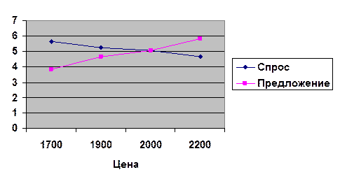 Необходимо подобрать значение констант а0,а1,b0,b1. Этот подбор осуществляется в два этапа. Первый этап. Эластичность предложения или спроса от цены может быть записана как Е = (Р/Q) * (∆Q/∆P), (3.3) где ∆Q/∆Р - изменение в требуемом или предлагаемом количестве в результате небольшого изменения цены. Для линейной зависимости отношение ∆Q/∆Р является постоянной величиной. Из уравнений (3.1) и (3.2) видно, что для предложения ∆Q/∆Р = а1 и для спроса ∆Q/∆Р = -b1 Теперь нужно подставить эти величины вместо ∆Q/∆Р в формуле эластичности: Предложение: Еs = а1∙(Р*/Q*) (3.4) Спрос: Еd = -b1∙(Р*/Q*) (3.5) Подставив данные из таблицы в (3.4) и (3.5), вычислим а1 и b1. Для мотокультиватора: a1=(Es∙Q*)/ Р*=(1,6∙5,04)/2000=0,004 b1=-(Ed∙ Q*)/ Р*=(0,8∙5,04)/2000=0,002 Для прицепа: a1=(Es∙Q*)/ Р*=(1,4∙2,64)/2700=0,0014 b1=-(Ed∙ Q*)/ Р*=(0,7∙2,64)/2700=0,0007 Второй этап. Вычисленные значения а1 и b1 вместе со значениями Р* и Q* необходимо подставить в уравнения (3.1) и (3.2) и решить эти уравнения относительно а0 и b0. Полученные значения а0,а1,b0,b1 однозначно определяют кривые спроса и предложения. Рассчитаем значения а0 и b0 Для мотокультиватора: a0=Q*-a1∙P*=5,04-0,004∙2000=-2,96 b0=Q*+b1∙P*=5,04+0,002∙2000=9,04 Для прицепа: a0=Q*-a1∙P*=2,64-0,0014∙2700=-1,14 b0=Q*+b1∙P*=2,64+0,0007∙2700=4,53 Построим графики зависимости спроса и предложения от цены мотокультиватора: При Р=2000 руб., Qп = -2,96 + 0,004∙2000 = 5,04 Qc = 9,04 – 0,002∙2000 = 5,04 При Р=1900 руб., Qп = -2,96 + 0,004∙1900 = 4,64 Qc = 9,04 – 0,002∙1900 = 5,24 При Р=1700 руб., Qп = -2,96 + 0,004∙1700 = 3,84 Qc = 9,04 – 0,002∙1700 = 5,64 При Р=2200 руб., Qп = -2,96 + 0,004∙2200 = 5,84 Qc = 9,04 – 0,002∙2200 = 4,64