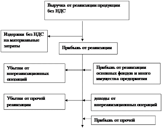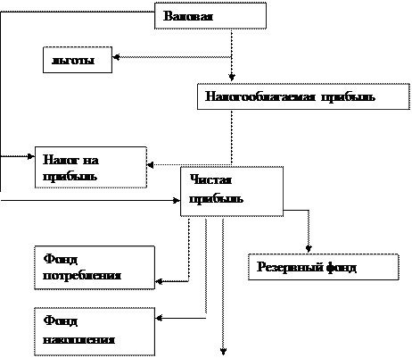 Выполняя расчеты, руководствовался следующей информацией. Налоговые выплаты - это совокупность налогов, сборов, пошлин и других платежей, взимаемых в установленном порядке. Налог - это обязательный взнос в бюджет, осуществляемый плательщиками в соответствии с законодательными актами. Налоги делятся на федеральные, налоги субъектов федерации и местные. Ввиду большого количества налогов и разных баз их исчислений в данной курсовой работе предусмотрено ограничиться расчетом налога на добавленную стоимость (НДС) и налога на прибыль. Размер ставок, объекты налогообложения, плательщики устанавливаются законодательными актами РФ. Объектом налогообложения является прибыль, расчет которой представлен на рисунке 1. Льготы по налогу на прибыль и расчет налогооблагаемой прибыли представлены на рис.2а. НДС взимается в размере: 10% - по продовольственным товарам кроме подакцизных , товарам для детей по перечню Правительства РФ; в размере 20% - по остальным товарам, включая подакцизные продовольственные товары. Объектом налогообложения является добавленная стоимость, определяемая как разница между стоимостью реализованных товаров, работ и услуг и стоимостью материальных затрат, отнесенных на издержки производства. Финансовым результатом деятельности предприятия является прибыль. Чистая прибыль, остающаяся в распоряжении предприятия идет в фонд потребления, фонд накопления, резервный фонд. Нераспределенная прибыль идет на выплату дивидендов учредителям. На увеличение резервного фонда, фондов потребления и накопления. Резервный фонд создается для покрытия кредиторской задолженности на случай прекращения деятельности предприятия в размере не более 25% от уставного капитала и не более 50% от налогооблагаемой прибыли. Рисунок 1. Алгоритм расчета прибыли предприятия.