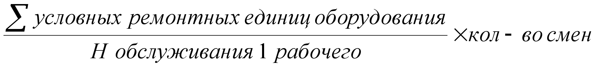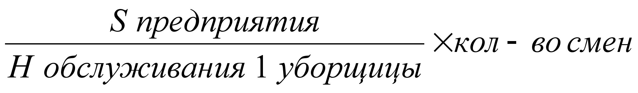 Чраб.= Норма обслуживания слесаря-ремонтника равна 80 условных ремонтных единиц, норма обслуживания слесаря-электрика - 250 условных ремонтных единиц. На основании расчётов списочная численность ремонтных рабочих составляет: слесарь-ремонтник – 1,98 человек, слесарь-электрик – 0,63 человека. Расчёт численности уборщиц производится по следующей формуле: