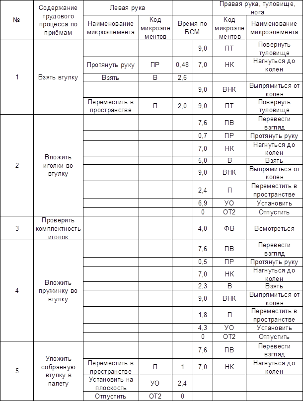 Содержание трудового процесса: 1. Взять втулку. 2. Вложить иголки во втулку (20 шт.). 3. Проверить комплектность иголок. 4. Вложить пружинку во втулку. 5. Уложить собранную втулку в палету. 2.1 На основе исходных данных производится расчленение приёмов на трудовые движения (микроэлементы) и определяется продолжительность трудового процесса при существующей системе организации рабочего места. Полученные данные записываются в таблицу 2.2. Таблица 2.2 Метод выполнения операции (существующий)