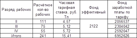 3.3 Определение списочной численности работающих Рсп. = Ряв*Ксп., (3.7) где Рсп. – требуемое среднесписочное число рабочих Ксп. – коэффициент среднесписочного состава Ксп. = Фпл ./ Фяв. (3.8) Ксп. = 303/266 = 1,139 Рсп. = 212*1,139 = 241 человек Численность вспомогательных рабочих (10% от численности основных): Рвсп. = 0,1*Ро = 0,1*242 = 24,2 = 24 чел. Р = Ро+Рвпом. = 242+24,4 = 266,2 = 266 чел. Чауп = 266*0,15/0,75 = 53 чел. Ч проч. персонала = 266*0,1/0,75 = 35 чел. 3.5 Расчёт фонда оплаты труда персонала предприятия Заработная плата по тарифу рабочих каждого тарифного разряда рассчитывается по формуле: Зтар = Тп *Тд *В*Ряв , (3.9) где Зтар – сумма заработной платы по тарифу; Тп - часовая тарифная ставка оплаты труда рабочих n-го разряда, руб; Тд – продолжительность рабочего дня, ч; В – количество выходов на работу одного рабочего в расчётном периоде. Тп =Т1*Кн, (3.10) где Т1 – тарифная ставка 1-го разряда; Кн – тарифный коэффициент n–го разряда (КнII =1,07 КнIII =1,2 КнIV =1,35). T1 = Тс / Кс , (3.11) где Тс – средняя тарифная ставка; Кс - средний тарифный коэффициент. Кс = ∑(Кн*ТРн )/∑ТРн , (3.12) где ТРн – трудоёмкость работ, имеющих одинаковые разряды. Кс = (1,07*554000*0,46+1,2*554000*0,31+1,35*554000*0,23)/554000= 650784/554000=1,17 Т1 = 5/1,17 = 4,27 Тп II = 4,27*1,07 = 4,57; Тп III = 4,27*1,2 = 5,12; Тп IV = 4,27*1,35 = 5,76. Зтар II = 4,57*7,98*266*212 = 2056537 Зтар III = 5,12*7,98*266*212 = 2304042 Зтар IV = 5,76*7,98*266*212 = 2592047 Приработок к заработной плате по тарифу рассчитывается по формуле: Nсу = Зтар *(Квн -1), (3.13) где Nсу – сумма сдельного приработка. Nсу = 6952626*(1,08-1) = 556210 Суммы премиальных доплат определяются по формуле: Зпр = Зсд *Ппр /100 (3.14) Зпр = 6952626*20/100 = 1390525 Таблица 3.5 Расчёт фонда заработной платы