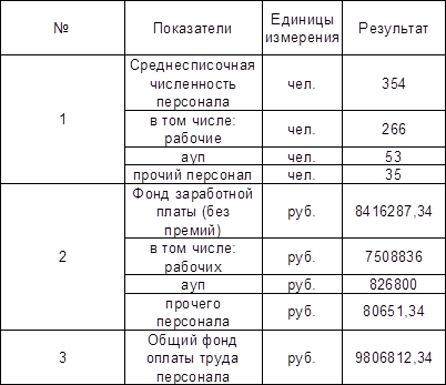 Фонд заработной платы вспомогательных рабочих составляет 80% от фонда оплаты труда основных рабочих, а сумма премий по фонду заработной платы – 20% от суммы премий основных рабочих. Заработная плата руководителей, специалистов и служащих (АУП) находится исходя из средней месячной заработной платы, принятой в регионе. Прочие категории работников оплачиваются в двукратном размере величины минимальной оплаты труда за месяц. Фз/п раб. = Зтар . + Nсу + Зпр . (3.15) Фз/п раб. = 6952626+556210+1390525,2 = 8899361,3 Фз/п впом. = Зтар ./Ро *Рвсп *0,8 = (6952626/242)*24*0,8 = 551613,3 Премии впом. = Зтар ./Ро *Рвсп *0,2 = (6952626/242)*24*0,2 = 137903,3 Зауп = Зср мес *12*Чауп = 1300*12*53 = 826800 Зп.п. = Зmin мес *Чпп*12*2*Кпоясн. = 83,49*35*12*2*1,15 = 80651,34 Таблица 3.6 Расчётные трудовые показатели предприятия