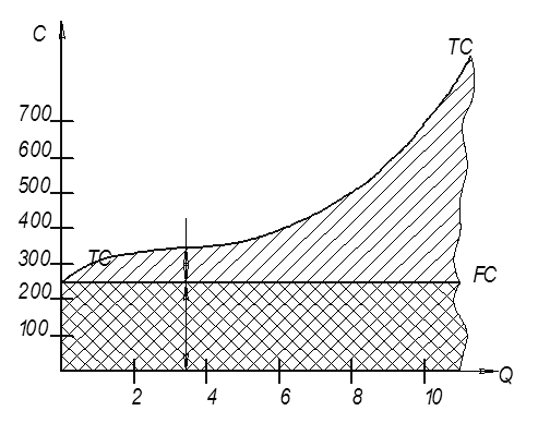 Постоянные издержки. В колонку 1 указаны различные уровни производства в единицу времени (от 0 до 10 единиц), в колонке 2 – Постоянные издержки фирмы в единице времени, которые равны 256руб., даже в том случае если фирма ничего не производит Постоянные издержки, как показывает само их название, являются постоянными; они составляются из прошлых обязательств, амортизационных отчислений, накладных расходов и т.п. Переменные издержки. Колонка 3 содержит оценки общей суммы Переменных издержек в единице времени при различных объемах производства. Согласно определению, когда продукция не выпускается, Переменные издержки равны 0. однако по мере роста выпускаемой продукции (Q) эти издержки изменяются. Сначала, с ростом производства, Переменные издержки растут очень быстро, но по мере дальнейшего увеличения продукции начинает сказываться фактор экономии на массовом производстве и рост Переменных издержек становится уже более медленным, чем расширение производства. В дальнейшем, однако, когда вступает в действие закон убывающей доходности, текущие Переменные издержки начинаю обгонять рост производства. Валовые издержки. Соответствующие данные показаны в колонке 4. Они являются ни чем иным, как суммой Постоянной Переменной издержек. Следовательно они существуют даже тогда, когда фирма не выпускает продукцию и в нашем случае равны 256руб. вместе с ростом Переменных издержек увеличиваются и Валовые издержки. На рисунке 3 эти 3 различные категории издержек представлены графически.