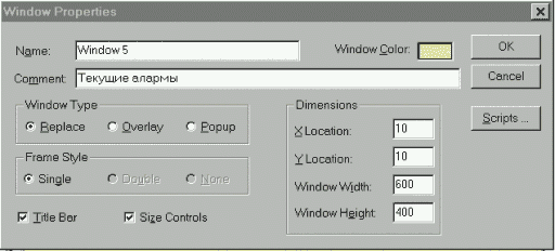 Проект, созданный в пакете InTouch, представляет собой набор окон (Window) с различными графическими и текстовыми объектами. Свойства каждого окна (наличие заголовка, цвет фона, размеры и т. д.) определяются при его создании. Создание нового окна производится в среде разработки WindowMaker щелчком по иконке панели инструментов General или командой File/New Window. На экране появится диалог Window Properties (Свойства окна, рис. 2).