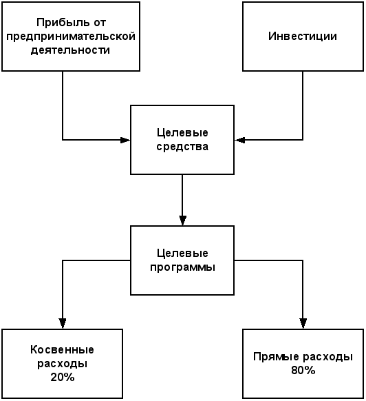 Такие расходы признаются расходами по обычным видам деятельности. Расходы, возникающие в рамках основной уставной непредпринимательской деятельности, учитываются не по экономическим элементам, а по статьям сметы (бюджета). Перечень этих статей организация определяет самостоятельно, а направления использования целевых поступлений может согласовывать только со своими донорами, жертвователями, гарантодателями, членами. Каждая некоммерческая организация несет расходы, которые непосредственно не связаны с потребителем результатов ее работы. Однако без этих расходов организация не может быть организованной, управляемой и финансируемой. Это расходы, необходимые некоммерческой организации для ее развития и поддержания жизнедеятельности в период отсутствия финансирования проектов. К непрямым (косвенным) расходам относятся заработная плата с начислениями (или ее часть) исполнительного директора, бухгалтера, сотрудников, занимающихся развитием организации, сбором средств, маркетингом, менеджеров по финансовым и кадровым вопросам, офис-менеджера, вспомогательного персонала, консультантов, а так же расходы по аренде помещения, оплате коммунальных услуг, копировальных работ, телефонной связи т. п. В случае если некоммерческая организация осуществляет несколько проектов, возникает вопрос о распределении административных расходов. Существует несколько способов распределения административных расходов. В РООИ «СОРАТНИК» распределение непрямых расходов между целевыми программами осуществляется поочередно. Таким образом, движение финансовых потоков в рамках уставной непредпринимательской деятельности некоммерческой организации РООИ «СОРАТНИК» может быть наглядно представлено в виде схемы, изображенной на рис. 5.