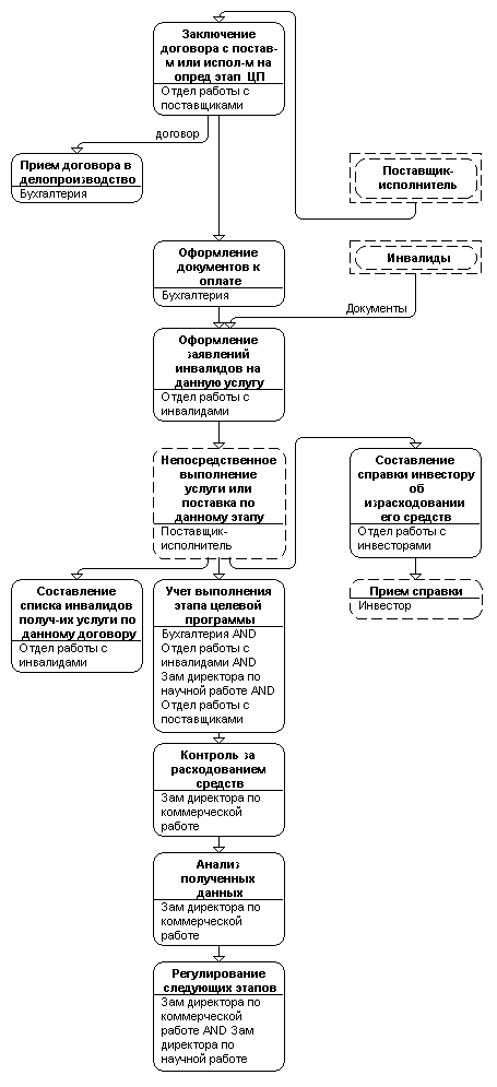 Подсистема управления работой с поставщиками-подрядчиками и производственными предприятиями выполняет функции по привлечению к сотрудничеству ведущих отечественных специалистов – реабилитологов и производителей реабилитационно-восстановительного оборудования. В рамках данной подсистемы заключаются договора на поставку оборудования, медикаментов и выполнения работ по медицинской и культурно-просветительской реабилитации инвалидов, ведется оформление всех сопутствующих данному процессу документов, а также заключаются договора по передаче собственных технологий производства реабилитационно-восстановительного оборудования в серийное производство. Подсистема управления маркетинговой деятельностью формируется для проведения предварительной аналитической работы в сфере формирования возможных вариантов целевых благотворительных программ реабилитации инвалидов и источников их финансирования. Для обеспечения этого процесса в подсистеме решаются следующие задачи: