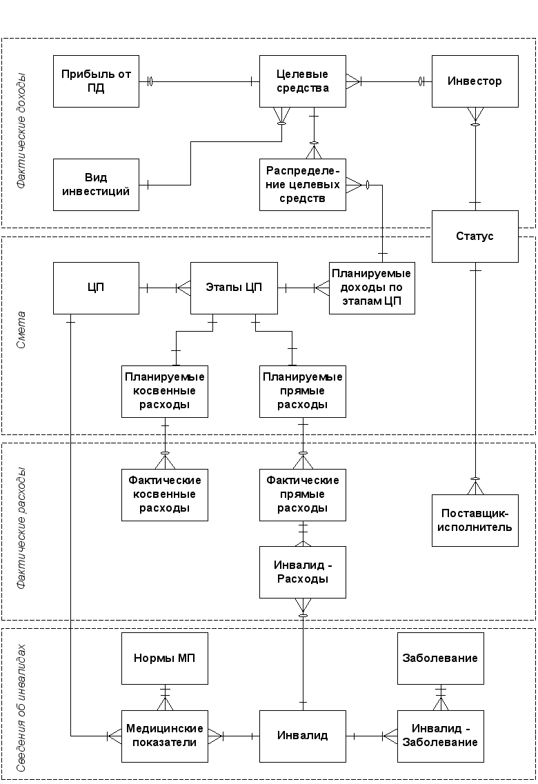 Проектирование и описание вышеуказанных моделей в данном проекте было выполнено при помощи ER-диаграмм (“сущность-связь” диаграммы). Основные компоненты ER-диаграмм - это сущности, атрибуты и связи. Каждая сущность является множеством подобных индивидуальных объектов, называемых экземплярами. Каждый экземпляр индивидуален и должен отличаться от всех остальных экземпляров. Атрибут выражает определенное свойство объекта. С точки зрения БД (физическая модель) сущности соответствует таблица, экземпляру сущности - строка в таблице, а атрибуту - колонка таблицы. Построение модели данных предполагает определение сущностей и атрибутов, т. е. необходимо определить, какая информация будет храниться в конкретной сущности или атрибуте. Сущность можно определить, как объект, событие или концепцию, информация о которых должна сохраняться. Сущности должны иметь наименование с четким смысловым значением, именоваться существительным в единственном числе, не носить "технических" наименований и быть достаточно важными для того, чтобы их моделировать. Именование сущности в единственном числе облегчает дальнейшее чтение модели. Фактически имя сущности дается по имени ее экземпляра. 2.3.1.1. Концептуальная модель БД Процесс создания информационной модели начинается с определения концептуальных требований пользователей системы. Требования отдельных пользователей интегрируются в едином обобщенном представлении, которое называют концептуальной моделью. Концептуальная модель представляет объекты и их взаимосвязи без указания способов их физического хранения. Таким образом, концептуальная модель является представлением предметной области. Но, в то же время концептуальная модель базы данных должна адекватно отображать состав данных в системе управления объектом, в нашем случае - управлением процессом разработки и реализации целевых программ в РООИ «СОРАТНИК». Она должна отображать взаимосвязь между данными и их структуру, обеспечивать достаточность информации и в то же время - исключать ее избыточность. Разработанная концептуальная модель базы данных не зависит от методов и средств дальнейшей ее реализации и использования базы в системе управления, то есть она не зависит от выбора системы управления базами данных, средств вычислительной техники, используемых на ее основе для решения управленческих задач. При концептуальном проектировании БД основным моментом является формирование модели "сущность – связь". Диаграмма "сущность - связь" (Entity Relationship Diagram, ER) предназначена для разработки модели данных и обеспечивает стандартный способ определения данных и отношения между ними. Она представляет собой модель данных верхнего уровня, и включает сущности и взаимосвязи, отражающие основные правила предметной области. Такая диаграмма не слишком детализирована, в нее включаются основные сущности и связи между ними, которые удовлетворяют основным требованиям, предъявляемым к ИС. Диаграмма "сущность - связь" может включать связи многие ко многим и не включать описание ключей. Как правило, ER используется для презентации и обсуждения структуры данных с экспертами предметной области. Проведенный на основании данных аналитического раздела и результатов преддипломной практики, анализ предметной области показал, что целесообразно всю пр