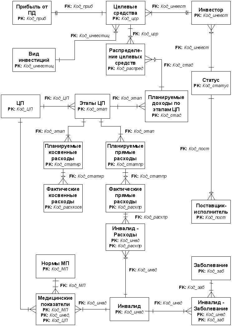 Р 2.3.1.2. Логическая модель БД Логический уровень - это абстрактный взгляд на данные, на нем они представляются так, как выглядят в реальном мире, и могут называться так, как они называются в реальном мире. Логическая модель является отображением концептуальной модели базы данных, реализация которой возможна в выбранной СУБД. Она отражает логические связи между элементами данных вне зависимости от их содержания и среды хранения. Логическая модель данных может быть реляционной, иерархической или сетевой. В реляционной модели данных объекты и взаимосвязи между ними представляются с помощью таблиц - отношений. Взаимосвязи также рассматриваются в качестве объектов. Каждая таблица состоит из строк и столбцов и должна иметь первичный ключ - поле или комбинацию полей, которые единственным образом идентифицируют каждую строку в таблице. Логическая модель базы данных рассматриваемой задачи, созданная под СУБД Access 97, представляет собой реляционную структуру и отображается диаграммой "сущность - связь", дополненной первичными и внешними, ключами (рис.37) и таблицами описания данных. Это более подробное представление данных, чем на этапе концептуальной модели. На этом этапе диаграмма "сущность - связь" включает описание всех сущностей с указанием первичных и внешних ключей. Она дополняется диаграммой описания данных, которая определяет каждое поле в базе данных, т. е. отражает имя поля, его тип и ширину. Таким образом, логическая модель базы данных представляет собой полную атрибутивную модель, которая дает наиболее детальное представление структуры данных: представляет данные в третьей нормальной форме и включает все сущности, атрибуты и связи.