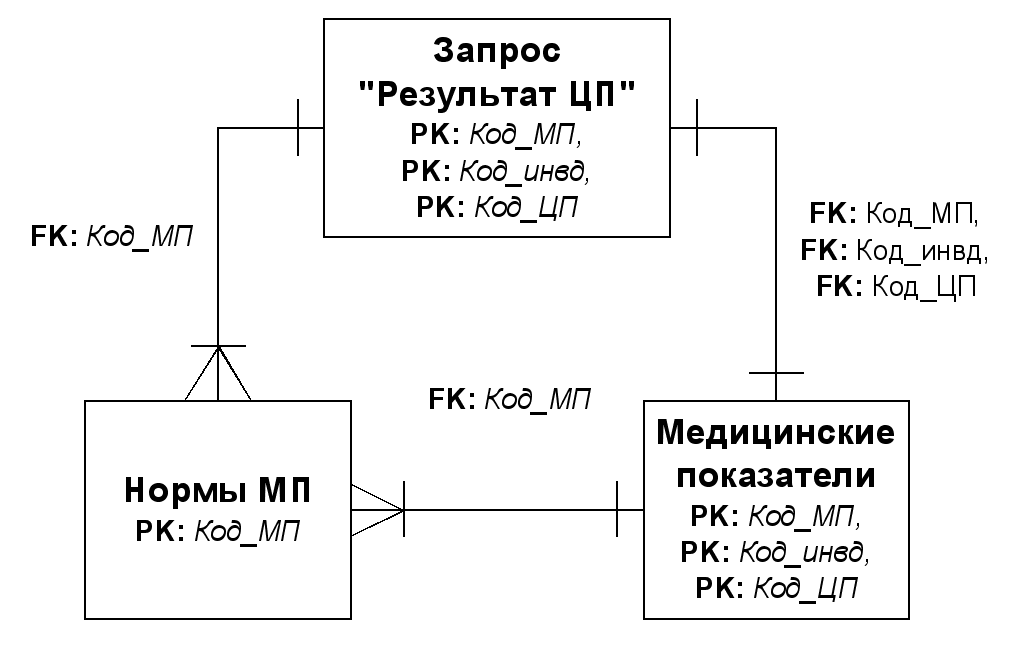 Рисунок 42 В разработанной базе данных РООИ «СОРАТНИК» необходимая для дальнейших манипуляций информация хранится в таблицах «Нормы МП» и «Медицинские показатели» (см п.п. 2.3.1.2.). Для того чтобы выявить влияние конкретной целевой программы на состояние здоровья инвалидов, принявших в ней участие, необходимо произвести фиксирование значений отдельных медицинских показателей каждого из обследуемых инвалидов до и после внедренной целевой программы. Таким образом, нам остается определить каким образом повлияла целевая программа на смещение априорных результатов по векторной шкале оценки медицинских показателей (рис. 43) и сделать соответствующие выводы. На рис. наглядно видно, что оптимальные результаты состояния здоровья инвалидов достигаются тогда, когда значения конкретных медицинских показателей попадают в интервал «норма». Соответственно, если в результате проведенного лечения значения показателей приблизились к этому интервалу, общее состояние обследуемого улучшилось, в противном случае наблюдается негативное влияние примененных методов лечения и медицинской реабилитации инвалидов. Таким образом, можно построить запрос, определяющий расстояние между значением до/после целевой программы и интервалом «норма» по каждому показателю. И определить качественные изменения в этих расстояниях.