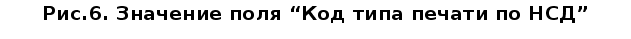 Значение поля “Признак печати” (5-9 разряды 1-го слова) 10011- регистрация НСД, 10101- регистрация НСД ОП, 10100- регистрация ФК, 10110- регистрация БС Регистрация НСД (признак печати = 10011). В младшем байте 4-го слова кодограммы при регистрации НСД записывается код типа печати, принимающий следующие значения (рис.6):