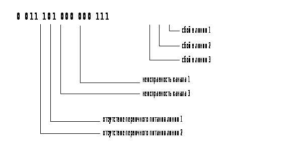 № устройства = 000001 для ПУ1, № устройства = 001000 для ПУ2, № устройства = 001111 для ПУ3. Наличие “0” или “1” в разрядах [0-5] 2-го слова кодограммы свидетельствует о наличии соответствующих признаков, смысловое содержание которых следующее: для ПУ1 [0,1] разряды 2-го слова [0] р. “1” - ПУ1 заблокировано по ФК оператором; [0] р. “0” - ПУ1 разблокировано по ФК оператором; [1] р. “1” - ПУ1 неисправно; [1] р. “0” - ПУ1 исправно. для ПУ2 [2,3] разряды 2-го слова [2] р. “1” - ПУ2 заблокировано по ФК оператором; [2] р. “0” - ПУ2 разблокировано по ФК оператором; [3] р. “1” - ПУ2 неисправно; [3] р. “0” - ПУ2 исправно. для ПУ3 [4,5] разряды 2-го слова [4] р. “1” - ПУ3 заблокировано по ФК оператором; [4] р. “0” - ПУ3 разблокировано по ФК оператором; [5] р. “1” - ПУ3 неисправно; [5] р. “0” - ПУ3 исправно. Кодограмма регистрации БС для Ш1, Ш2, Ш3 выглядит следующим образом: