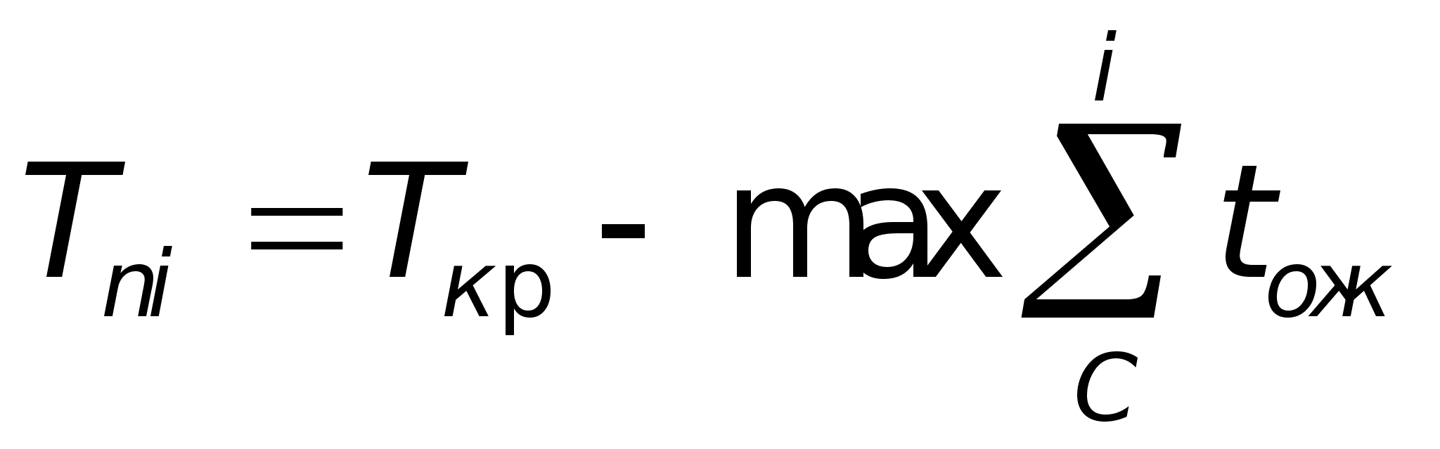 Критический путь сети (Ткр) - максимальный путь от исходного события 1 до завершающего события С. Поздний срок наступления события (Tni) - максимально допустимый срок наступления данного события, при котором сохраняется возможность соблюдения ранних сроков наступления последующих событий, равен разности между продолжительностью критического пути и наибольшего из путей, ведущих от завершающего события данному (формула (4)).