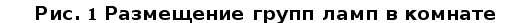 где Emax, Emin и Eср показатели освещённости для газоразрядных ламп при питании их переменным током – соответстсвенно максимальная, минимальная и средняя. Возьмём по аналогии [16], табл. 4 люминесцентную лампу ЛХБ приблизительно той же мощности. Включением смежных ламп в разные фазы (группы) трёхфазной электрической сети возможно добиться уменьшения коэффициента пульсации КП с 35 до 3 – т.е. почти в 12 раз (рис. 1). На рис. 1 указаны три выключателя (по одному на каждую фазу – группу ламп) – это необходимо для обеспечения возможности независимого управления группами ламп.
