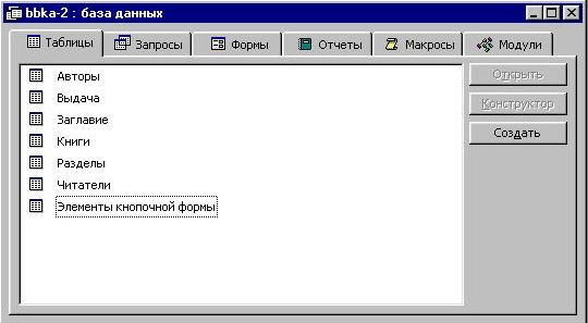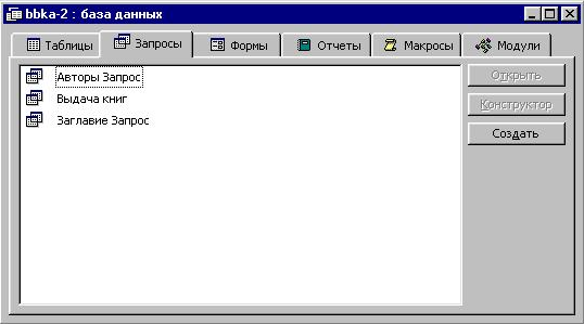 Таблица «Авторы» состоит из следующих полей: · Код автора · Имя автора Эта сущность отводится для хранения сведений об основных людях, принимавших участие в подготовке рукописи издания (авторах, составителях, титульных редакторах, переводчиках и художниках). Такое объединение допустимо, так как данные о разных создателях выбираются из одного домена (фамилия и имена) и исключает дублирование данных Так как фамилия и имена (инициалы) создателя могут быть достаточно громоздкими (М.Е. Салтыков-Щедрин, Франсуа Рене де Шатобриан, Остен Жюль Жан-Батист Ипполит и т.п.) и будут многократно встречаться в разных изданиях, то их целесообразно нумеровать и ссылаться на эти номера. Для этого вводится целочисленный атрибут "Код_автора" – это ключевое поле, которое будет автоматически наращиваться на единицу при вводе в базу данных нового автора. Поле «Имя автора» является текстовым типом данных. Таблица «Выдача» состоит из следующих полей: · Код формуляра · Дата выдачи (книги) · Срок · Дата возврата · Инвентарный номер (который индивидуален для каждой книги) Поле «код формуляра» предназначено для присвоения каждому формуляру индивидуального номера, оно имеет тип данных «счетчик». В поле «дата выдачи» указывается дата выдачи определенного экземпляра. Тип данных – «дата/время». В поле «Срок» указывается срок на который выдается книга. В случае задержки книги, налагается штраф, который определяется библиотекой. Тип данных – «числовой». В поле «Дата возврата» ставится дата возвращения экземпляра. Если поле не заполнено, значит книга не возвращена т.е. на руках. Тип данных – «дата/время». Поле «Инвентарный номер» необходимо для присвоения каждой книге индивидуального номера. Это поле является ключевым, тип данных – «числовой». Таблица «Заглавие» состоит из следующих полей: · Код заглавия · Заглавие Поле «Код заглавия» - ключевое поле с типом данных «счетчик». Оно позволяет сократить объем данных и снизить вероятность возникновения противоречивости (исключается необходимость ввода длинных текстовых названий для различных томов собраний сочинений, повторных изданий, учебников и т.п.). В поле «Заглавие» пишутся заглавия книг, тип данных поля – «текстовый». Таблица «Книги» состоит из следующих полей: · Инвентарный номер · Код заглавия · Код раздела · Код автора Данная таблица является главной . С ее помощью все основные таблицы связаны друг с другом. В случае добавление в базу данных новых таблиц (например о цене книг) нет необходимости изменять всю структуру. Нужно всего лишь добавить ключевое поле новой таблицы в таблицу «Книги» и установить между ними связь. Таблица «Разделы» состоит из следующих полей: · Код раздела · Название раздела В данной таблице содержатся четыре раздела, названия которых не соответствуют общепринятому стандарту. Таблица «Читатели» состоит из следующих полей: · Код формуляра · Фио (инициалы читателя) Эта таблица содержит сведения о читателях, записанных в данной библиотеке. 4.2.2 ЗапросыЭти объекты служат для извлечения данных из таблиц и предоставления их пользователю в удобном виде. С помощью запросов выполняют такие операции как отбор данных, их сортировку и фильтрацию. С помощью запросов можно выполнять преобразования данных по заданному алгоритму, создавать новые таблицы, выполнять автоматическое наполне