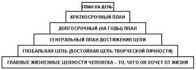 Сначала укладывается массивное основание пирамиды, служащее опорой для всех остальных этажей. Человек определяет свои жизненные ценности (грубо говоря, то, чего он хочет от жизни). Для одного это материальный достаток и уверенность в завтрашнем дне. Для другого - благополучная семья, любящая жена и счастливые дети. Для третьего - слава и высокий социальный статус. Для четвёртого - власть. Для пятого - познание. Для шестого - служение во имя человечества… Список можно продолжать до бесконечности, тем более что обычно у человека есть некое множество жизненных ценностей. Этап определения жизненных ценностей является наиболее важным в построении пирамиды - если на этом этапе будет допущена ошибка (например, человек выберет "познание" и "служение людям", хотя на самом деле для него важны в первую очередь "известность" и "высокий социальный статус"), то впоследствии его неизбежно постигнет разочарование. Итак, первым делом надо составить список жизненных ценностей, причём не надо бояться потратить на это слишком много времени - важно хорошо обдумать список. Необходимо убедиться, что выбранные ценности не противоречат друг другу. Следующий этап - построение второго этажа пирамиды, опирающегося на первый. Исходя из составленного списка, человек должен решить, чего он хочет добиться. В терминологии ТРИЗ-ТРТЛ это "выбор Достойной Цели". Например, если кто-то считает, что для него наиболее важны "известность", "власть" и "высокий социальный статус", он может решить, что он хочет стать президентом США. Надо поставить перед собой глобальную цель. Важно убедиться, что выбранная цель действительно отвечает всем жизненным ценностям из составленного на предыдущем этапе списка. Третий этаж пирамиды опирается на второй. Составляется генеральный план - что, по большому счёту, необходимо, чтобы достичь поставленной на предыдущем этапе цели. Например, для того, чтобы стать президентом США, надо сперва стать губернатором штата или мэром одного из крупных городов США, надо иметь партийную и/или финансовую поддержку, надо быть известным публике блестящим оратором, надо иметь незапятнанную репутацию, надо быть солидным женатым человеком, надо получить высшее образование в престижном учебном заведении и т.п. Так и пишется план. Поставив перед собой цель, следует составить генеральный план достижения цели. Четвёртый этаж пирамиды - долгосрочный (на несколько лет) промежуточный план с указанием конкретных целей и конкретных сроков. Весьма важно указать, достижению, какого именно (каких именно) пункта генерального плана способствует достижение данной конкретной цели. Ещё более важно указание конкретного срока - если человек говорит себе: "Когда-нибудь я обязательно куплю машину (напишу книгу, пойду учиться в университет…)", он может тянуть годами и в результате так и не достигнуть цели, но если он назначает себе конкретный срок, он значительно увеличивает шансы добиться своего. Например, если человек планирует стать президентом и знает, что для этого нужно иметь высшее образование, он может включить в свой пятилетний план следующий пункт: "До конца 19хх года закончить с отличием Гарвардский Университет по специальности 'социология и политология' - это, во-первых, даст мне требуемое высшее образование, и, во-вторых, я смогу завести знакомства с важными для мен