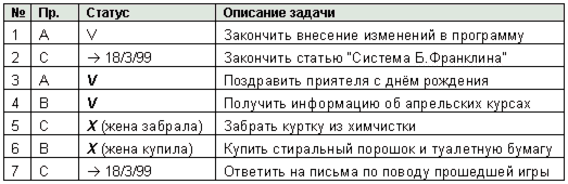 Многие люди, применяющие систему Франклина, отмечают, что она помогает значительно повысить эффективность работы - как за счёт более эффективного управления временем, так и за счёт планирования самой работы. В заключение следует обратить внимание на то, что использование системы Франклина ни в коей мере не входит в противоречие с применением системы Любищева. Наоборот, одновременное использование обеих систем может быть вдвойне эффективно, т.к. позволяет взглянуть и "вперёд", и "назад". |