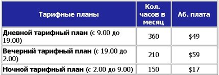 Ниже приведен ряд таблиц иллюстрирующих тарифы на Dial Up доступ в интернет