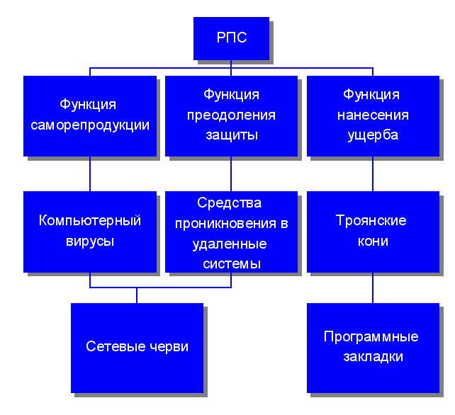 Вычислительная среда Сетевой адаптер Компьютер 1 Дисковая подсистема Клавиатура 3 1 Рис. 4. Классификация угроз безопасности ВС. 2 . Аппаратно-техническое вмешательство в работу ВС . Имеется в виду нарушение безопасности и целостности информации в ВС с помощью технических средств, например, получение информации по электромагнитному излучению устройств ВС, электромагнитные воздействия на каналы передачи информации и другие методы. Защита от таких угроз, кроме организационных мер, предусматривает соответствующие аппаратные (экранирование излучений аппаратуры, защита каналов передачи информации от прослушивания) и программные меры (шифрация сообщений в каналах связи). 3 . Разрушающее воздействие на программные компоненты ВС с помощью программных средств . Такие средства называются разрушающими программными средствами (РПС) . К ним относятся компьютерные вирусы, троянские кони (или “закладки”), средства проникновения в удаленные системы с использованием локальных и глобальных сетей. Средства борьбы с подобными атаками состоят из программно и аппаратно реализованных систем защиты. Современные программные угрозы информационной безопасности. Класс РПС составляют компьютерные вирусы, троянские кони (закладки) и средства проникновения в удаленные системы через локальных и глобальных сетей (рис. 5). В настоящее время эволюция средств РПС от простейших программ, осуществляющих НСД, к действующим самостоятельно удаленным сетевым агентам, которые представляют собой настоящие средства информационного нападения. Дать формальное определение понятию “компьютерный вирус” очень непросто. Традиционное определение, данное Ф. Коэном, “компьютерный вирус — это программа, которая может заражать другие программы, модифицируя их посредством добавления своей, возможно измененной, копии”, ключевым понятием в определении вируса является его способность к саморазмножению, — это единственный критерий, позволяющий отличить программы-вирусы от остальных программ. При этом “копии” вируса действительно могут структурно и функционально отличаться между собой. История компьютерных вирусов начинается еще с работ теоретика современных компьютеров фон Неймана. Он разрабатывал модели автоматов, способных к самовоспроизведению, и математически доказал возможность существования таких машин. После этого идея саморазмножающихся программ “витала в воздухе” и время от времени находила свою более или менее адекватную реализацию. С каждым годом число вирусов растет. Сейчас их уже более 7000. Считается признанным, что в последние годы больше всего вирусов создавалось в СССР, а затем в России и других странах СНГ. Но и в других странах, в том числе в США, значителен урон, наносимый вирусами. В США борьба с вирусами ведется на самом высоком уровне. Вскоре после объявления в 1993 году Белым домом о подключении президента Билла Клинтона и вице-президента Альберта Гора к сети Internet администрация поддержала идею проведения Национального дня борьбы с компьютерными вирусами (National Computer Virus Awareness Day). Такой день отмечается теперь ежегодно. Национальной ассоциацией по компьютерной защите США (NCSA) и компанией Dataquest опубликованы следующие данные по результатам исследований” вирусной проблемы(данные 1993 г.): · опрошенных пострадали от компьютерных вирусов; ·