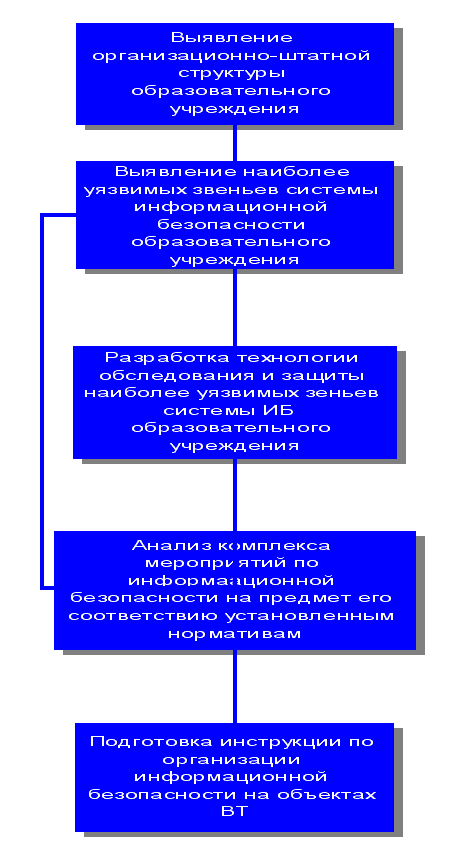 Рис. 7. Схема методики реализации политики безопасности. Заключение. В ближайшее время прогресс в области развития средств вычислительной техники, программного обеспечения и сетевых технологий даст толчок к развитию средств обеспечения безопасности, что потребует во многом пересмотреть существующую научную парадигму информационной безопасности. Основными положениями нового взгляда на безопасность должны являться: · исследование и анализ причин нарушения безопасности компьютерных систем; · разработка эффективных моделей безопасности, адекватных современной степени развития программных и аппаратных средств, а также возможностям злоумышленников и РПС; · создание методов и средств корректного внедрения моделей безопасности в существующие ВС, с возможностью гибкого управления, безопасностью в зависимости от выдвигаемых требований, допустимого риска и расхода ресурсов; · необходимость разработки средств анализа безопасности компьютерных систем с помощью осуществления тестовых воздействий (атак). В условиях современной суверенизации государств и субъектов Российской Федерации, продолжающихся военных конфликтов, попыток территориальных, экономических и др. притязаний государств друг к другу, растущей угрозы терроризма в отношении отдельных граждан и государственных структур особенно остро встали проблемы надежной защиты информации в особые периоды управления важными государственными объектами, включая ВС. Это требует дальнейшего развития теории и практики обеспечения информационной безопасности в системе МВД России, повышения надежности применения современных систем обработки конфиденциальной информации в условиях обострения информационной войны (борьбы). Широкая информатизация обществ, внедрение компьютерной технологии в сферу управления объектами государственного значения, стремительный рост темпов научно-технического прогресса наряду с положительными достижениями в информационных технологиях, создают реальные предпосылки для утечки конфиденциальной информации. В дипломной работе, основной целью которой являлось разработка общих рекомендаций по защите информации в системах обработки данных образовательных учреждений МВД РФ и разработка пакета руководящих документов по обеспечению безопасности информации, получены следующие результаты: 1. Рассмотрены основные пути защиты от несанкционированного доступа к информации циркулирующей в системах обработки данных. 2. Произведена классификация способов и средств защиты информации. 3. Детально осуществлен анализ методов ЗИ в системах обработки данных. 4. Рассмотрены основные направления защиты информации в СОД. 5. Разработаны концепция безопасности локальных вычислительных сетей образовательного учреждения МВД РФ и вопросы обеспечения безопасности при групповой обработке данных в службах и подразделениях института. 6. Осуществлена выработка политики безопасности конкретного образовательного учреждения и дана методика реализации этой политики. 7. Разработан пакет руководящих документов по обеспечению безопасности информации в Краснодарском юридическом институте. В перспективе рассматривается возможность разработки общих рекомендаций по защите информации для всех образовательных учреждений МВД России, и создание типовой инс