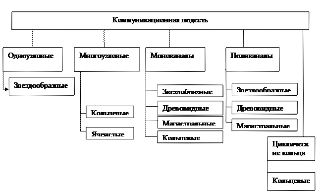 В соответствии с определением коммуникационной подсети выделим пять ее типов: одноузловая, многоузловая, моноканальная, поликанальная, циклическое кольцо.