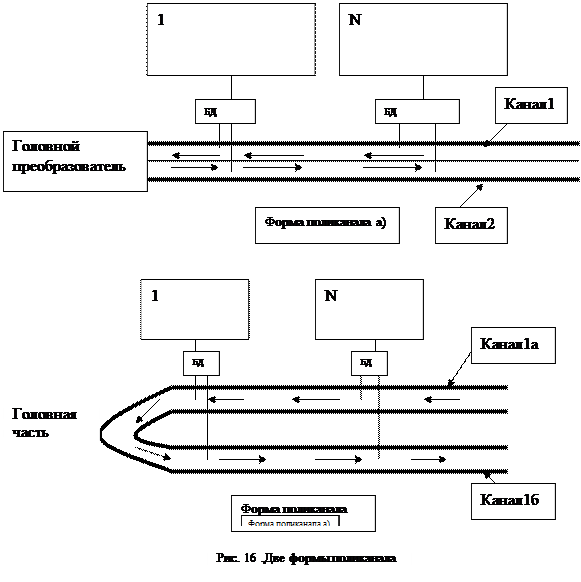 Существует (рис. 16) два метода передачи информации в поликанале. Первый из них заключается в том, что в поликанале выделяются пары частотных каналов, передача информации по которым осуществляется на различных частотах (на рис. 3.19,а показана только одна пара каналов). Канал 1 здесь собирает блоки данных, передаваемые абонентскими системами. Что же касается канала 2, то он, наоборот, раздает этим системам полученные им блоки данных. А так как каналы работают на разных частотах, то поликанал имеет головной преобразователь частоты. Его задачей является передача блоков, полученных из канала 1, в канал 2. Второй метод передачи информации заключается в том, что кабель делает (рис. 16,6) петлю в головной части поликанала и благодаря этому дважды проходит мимо всех блоков доступа. Одна его часть (подканал 1а) собирает блоки данных, а вторая (подканал 16) — раздает эти блоки. Такой поликанал назовем петлеобразным. Сравнивая оба метода, следует отметить, что при использовании первого из них длина дорогостоящего поликанала (вместе с каналообразующими элементами: повторителями, расщепителями и т. д.) сокращается вдвое. Однако при этом вдвое уменьшается и пропускная способность поликанала, ибо одна его половина собирает, а вторая — раздает те же блоки данных. Поэтому выбор метода зависит от экономических факторов и необходимой пропускной способности поликанала.