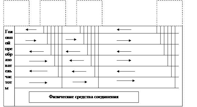 Общее звено Рис.15. Звездообразный моноканал выполненный на световодах Абоненты моноканала оперируют только электрическими сигналами, а по световодам передаются лучи света. Поэтому блоки доступа в схеме, приведенной на рис. 15, кроме своих обычных функций выполняют операции, связанные с преобразованиями электрических сигналов в световые и обратно. Технологически источник и преобразователь света должны быть точно подключены к торцу световода. Поэтому сейчас каждый световод передает информацию только в одном направлении. Вследствие этого каждый луч звездообразного общего звена схемы, изображенной на рис. 10, представляется на рис. 15 двумя световодами. Распределительный блок благодаря осуществляемому в нем смешению световых сигналов обеспечивает передачу света, полученного по одному из лучей, всем исходящим из него лучам общего звена. Число лучей, а следовательно, и количество подключаемых к моноканалу абонентских систем могут достигать сотен. Естественно, что при наличии в моноканале абонентов источник света должен иметь мощность, достаточную для восприятия, приемниками света после деления света в распределительном блоке на N частей. Световоды используются и в магистральных моноканалах. Однако из-за технических трудностей, связанных с созданием ответвлений к блокам доступа, число последних не превышает пока десяти. Моноканал является эффективным средством соединения значительного числа абонентских систем, имеющим серьезные преимущества: Недостатки. Достоинства: - возможность одновременной передачи данных и речи, - высокие скорости передачи информации, - простота прокладки моноканала, - большая надежность работы, - возможность подключения новых систем без остановки информационно-вычислительной сети, - малая общая длина всех звеньев моноканала. Вместе с тем моноканал обладает и рядом недостатков: - высокая стоимость физической среды, - сильные шумы, появляющиеся в моноканале при большом числе блоков доступа, - относительно сложные формы управления передачей. 3.2 ПоликаналНередко в информационно-вычислительных сетях для передачи7 данных используются методология и техника стандартного кабельного телевидения, обеспечивающие особенно высокую пропускную-способность. Так как производительность и скорость передачи данных здесь велики, то в физической среде выделяются частотные полосы. Поэтому через физическую среду, которой, как правило, является широкополосный коаксиальный кабель, передаются аналоговые (а не дискретные) сигналы. Частотная полоса может выполнять те же функции, что и физическая среда рассмотренного в предыдущем параграфе моноканала, — передавать информацию от абонентской системы-отправителя ко всем абонентским системам информационно-вычислительной сети. Если обеспечить взаимодействие такой частотной полосы с необходимым числом блоков доступа, то получим коммуникационную подсеть, именуемую частотным многоточечным .каналом. В случаях, когда это необходимо, в частотной полосе выделяется нужное число частотных, субполос, каждая из которых имеет небольшую пропускную способность и обеспечивает соединение .двух абонентских систем. Связав субполосу с блоками доступа, .можно создать частотный двухточечный канал. Назовем поликаналом группу коммуникационных подсетей, •созданных на базе единой 