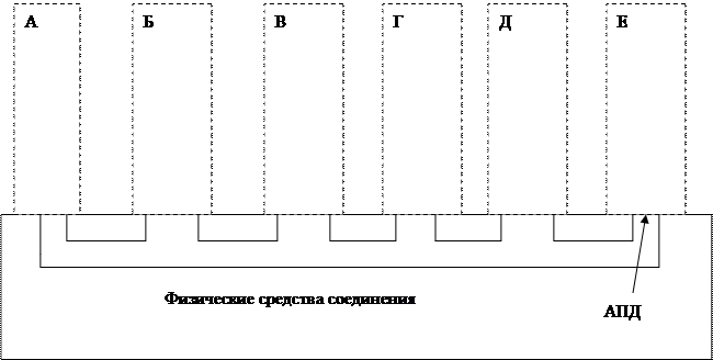 Рис. 3. Одноузловая коммуникационная подсеть Одноузловая коммуникационная подсеть состоит (рис.3) из одной коммуникационной системы (заштрихованный кружок) и группы абонентских каналов, каждый из которых соединяет абонентскую систему с коммуникационной. Этим и определяется название подсети. Каждый канал заканчивается аппаратурой передачи данных, к которой с наружной части подсети подключаются абонентские системы (пунктирные прямоугольники А—Д). Точки подключения абонентских систем к аппаратуре передачи данных, определяют интерфейс коммуникационной подсети. Естественно, что одноузловая подсеть может иметь только одну форму звездообразную. Логическая структура одноузловой коммуникационной подсети, соответствующая схемам, представленным на рис.4.
