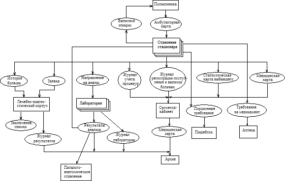 Рис. 6. Схема документооборота специализированного отделения стационара 2.1.3. Лечебно-диагностический корпус Лечебно-диагностический корпус является подразделением СООД и объединяет отделение функциональной диагностики, отделение ультразвуковых исследований, эндоскопическое и рентгенологическое отделения, операционный блок, отделение реанимации, барозал, лаборатории и аптеку. Рассмотрим подробнее состав и назначение основных подразделений лечебно-диагностического корпуса. 2.1.3.1. Отделение функциональной диагностикиОтделение функциональной диагностики состоит из кабинетов функциональной диагностики, которые предназначены для проведения исследований с использованием современных методов диагностики с целью уточнения диагноза и оценки эффективности лечения. Отделение функциональной диагностики включает кабинеты электрокардиографии, фонокардиографии и деографии легких. Пациенты направляются на обследование в кабинеты функциональной диагностики из всех специализированных отделений стационара, которые формируют предварительные заявки на обследование. После проведения обследования заключение передается в отделение лечащему врачу и подклеивается к медицинской карте. Результаты обследования заносятся в журналы, которые хранятся в кабинете. Аналогично осуществляется взаимодействие палатных отделений стационара с рентгенотделением, которое состоит из кабинетов общей диагностики, инвазивной диагностики и маммографии. 2.1.3.2. Лабораторная службаЛабораторная служба СООД - это специализированное подразделение, предназначенное для проведения лабораторных исследований биоматериалов, которые поступают из всех отделений стационара. Лабораторная служба включает в себя клиническую, биохимическую, гематологическую, бактериологическую, иммунологическую, гистохимическую, гистологическую и цитологическую лаборатории, а также лабораторию радионуклидной диагностики. Биоматериал поступает в лабораторию с направлением, где указаны ФИО пациента, у которого он взят, отделение и ряд служебных параметров. Поступившие биоматериалы регистрируются в журнале регистрации и разносятся вместе с направлениями по лабораториям. В лаборатории просматриваются данные о пациенте и перечень проводимых методик записывается в журнал лаборатории. Каждый лаборант формирует для себя из журнала программу на день по выполняемому им перечню методик. По выполнении методики результаты заносятся в журнал лаборатории и в направление, которое передается врачу-диагносту. Врач лаборатории по результатам анализов формирует заключение и рекомендации. При необходимости он может назначить повторное или дополнительное исследование. По окончании этой работы направления с результатами, заключениями и рекомендациями передаются в регистратуру, а затем разносятся по отделениям. На основании журналов лабораторий ежемесячно формируются отчеты о проведенных исследованиях. Схема документооборота лаборатории приведена на рис. 7.