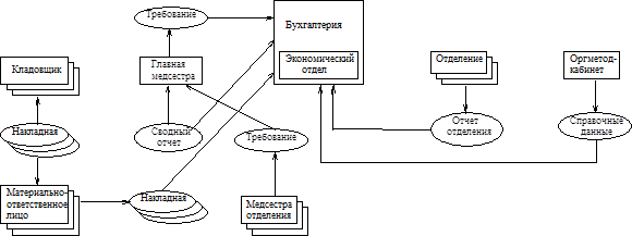 Рис. 8. Схема бухгалтерского документооборота 2.2. Особенности и недостатки в организации работы СООД СООД - это сложная организационная структура, все подразделения которой работают в тесном контакте друг с другом для обеспечения взаимосвязи и приемственности в лечении больных. СООД охватывает своим обслуживанием практически все население Самарской области (свыше 3,2 млн человек). Нагрузка на подразделения СООД по статистике составляет : - поликлиника - 62000 посещений в год; - стационар - 8500 человек в год; В подразделениях СООД собирается и обрабатывается большой объем информации о поступлении, лечении и движении больных в стационаре и поликлинике. Большая часть этой информации обрабатывается сотрудниками ОМК и ИВЦ. В подразделениях СООД и между ними циркулирует большой поток медицинской документации, часть которой неоднократно дублирует по содержанию друг друга. По статистике суточный документооборот в СООД составляет более 10 тысяч документострок. Результаты предпроектного обследования СООД позволили выявить следующие недостатки существующей системы управления: - необходимость ведения дополнительных журналов регистрации и учета больных по всем службам СООД, что приводит к дополнительным неоправданным затратам рабочего времени медперсонала; - отсутствие оперативной связи между службами СООД вызывает необходи-мость заполнения и передачи множества учетных и промежуточных форм, дублирующих основную информацию (статистический талон, направление, контрольная карта диспансерного наблюдения, статистическая карта выбывшего из стационара и т. п.), что приводит к частичной потере информации, непроизводительным затратам рабочего времени, необходимости содержать дополнительный штат работников; - отсутствие возможности получения оперативной информации о больном приводит к увеличению сроков обследования больного, к дублированию обследований, задержке в назначении соответствующего лечения, в результате чего увеличивается время пребывания на больничном или в стационаре; - отсутствие оперативности в получении информации по группам больных, по нозологическим единицам, по проведенным обследованиям и т.д. приводит к искажению информации на момент ее получения; - трудоемкость в обработке информации, полученной в результате обследования больного, ведет к неоперативному получению ее лечащим врачем, снижению пропускной способности кабинета, невозможности введения новых методов обследования; - отсутствие необходимой оперативной информации в связи с громоздкостью ее сбора и систематизации не позволяет делать оперативный углубленный анализ деятельности для разработки мероприятий по улучшению работы; - трудность доступа к информации, необходимой для установки дифференциального диагноза, приводит к необоснованному привлечению к консультации чрезмерного количества узких специалистов, назначению ненужных методов обследования; - значительная часть рабочего времени медперсонала тратится на оформление документов, что сокращает время непосредственного контакта с больным, время диагностического обследования, ухудшает качество работы врача; - существующая система передачи информации на бумажных носителях из одного подразделения в другое приводит к потерям рабочего времени и увеличивает вероятность потери информац